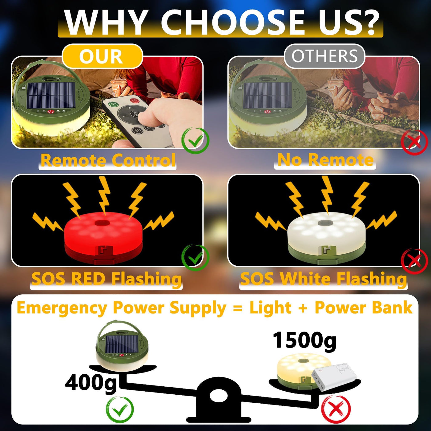 Camping String Lights, Portable Waterproof Solar Powered Camping Light with Snap Hook, 33ft String Camp Lantern USB Rechargeable 3600mAh Power Bank with Remote for Christmas Trees, Yard Decorations