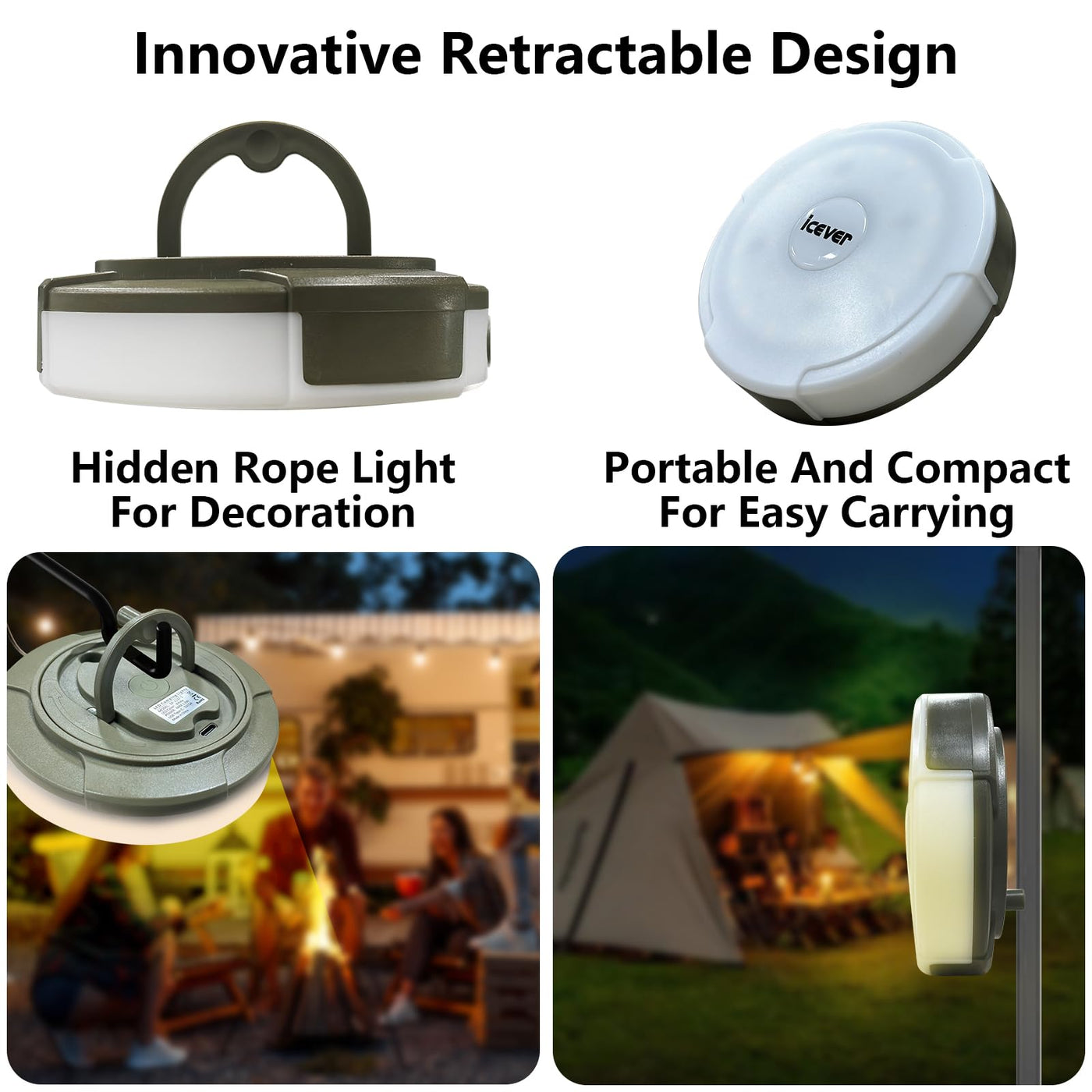 Revolutionary Design For 2024: Icever'S 16.4Ft Rgb Camping Light Introduces An Unparalleled Design Innovation For 2024, Featuring A Retractable Decorative Rope Light That Provides Multiple Color Changes Illumination. Ideal For Enhancing Your Camping, Market, And Garden Experiences, It Combines Functionality With Aesthetic Appeal In A Portable And Easily Rechargeable Form