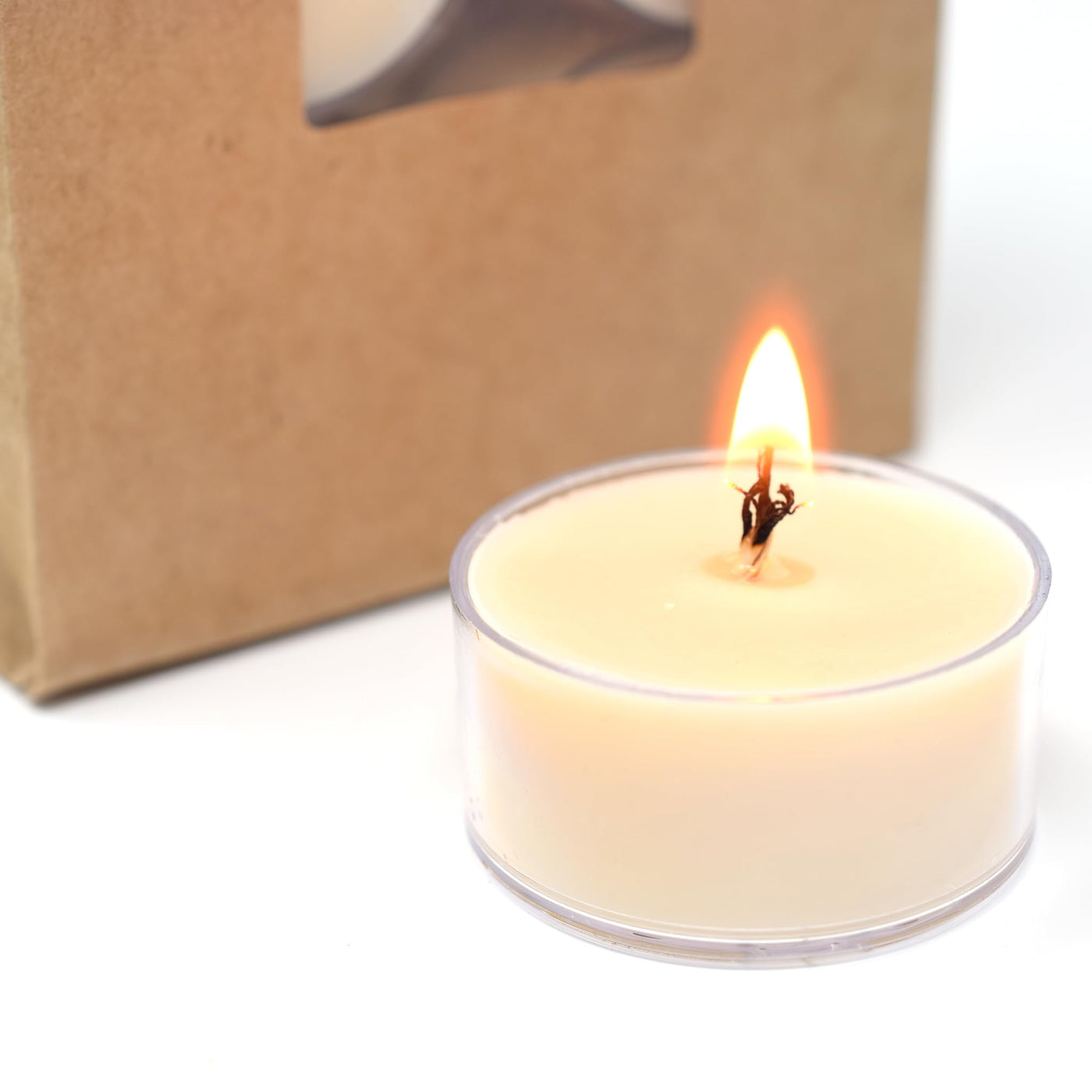 Made with renewable, USA grown soy wax. If you have been looking for an Eco-friendly, healthier alternative to paraffin tea lights, then you are in the right place! Our soy tea light candles are handmade with 100% GMO-free soy wax, a pure cotton wick, and a flame retardant clear tea light cup that allows the beautiful glow of the flame to shine through. Not only do our soy tea light candles burn cleaner than paraffin tea lights, they are also long lasting, with 5-6 hours of burn time per tealight! Our true to life strong scents will help you relax and unwind after a long day, transporting you to faraway places in your imagination and setting the perfect mood for your day. Use them to complement a romantic evening, to add the perfect glow to your bubble bath, or just to enjoy the amazing scent!