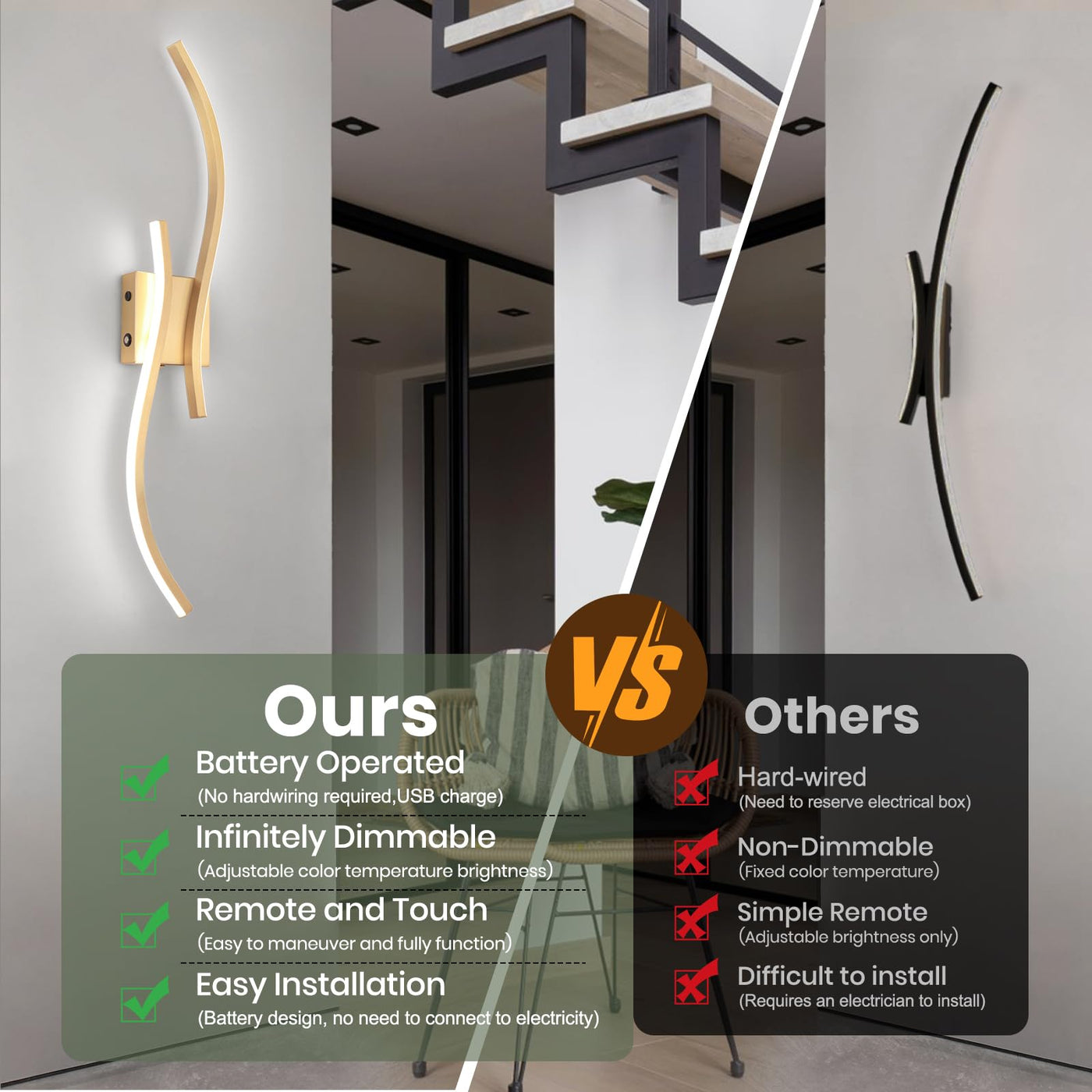 Specification Style: Modern/Simple/Nordic Type: battery operated wall lights Body color: gold Input voltage: 110V-260V Power: 18W Size:L31.5*H5.9inch(L80*H15cm) Plate diameter: L4.3*W5.9Inch(L11*W15cm) Adjustable color temperature: 3000K-4500K-6000K Adjustable brightness: 10%-100% Dimmable: Dimmable with Remote control Illumination Range: 3-8 Square meter Material: Aluminum, acrylic Light Source: Build in LED Warranty:One year Application:bathroom,living room,bedroom,kitchen,dining room,hallway,porch,balcony,aisle ,corridor,staircase,Office and so on. Package list 2*battery operated wall sconce 1*Remote control1*User Manual 1*Install Accessories Warm tip: Please cut off the power when install ,For safe,we suggestion you ask Professional electrician to finsh install.