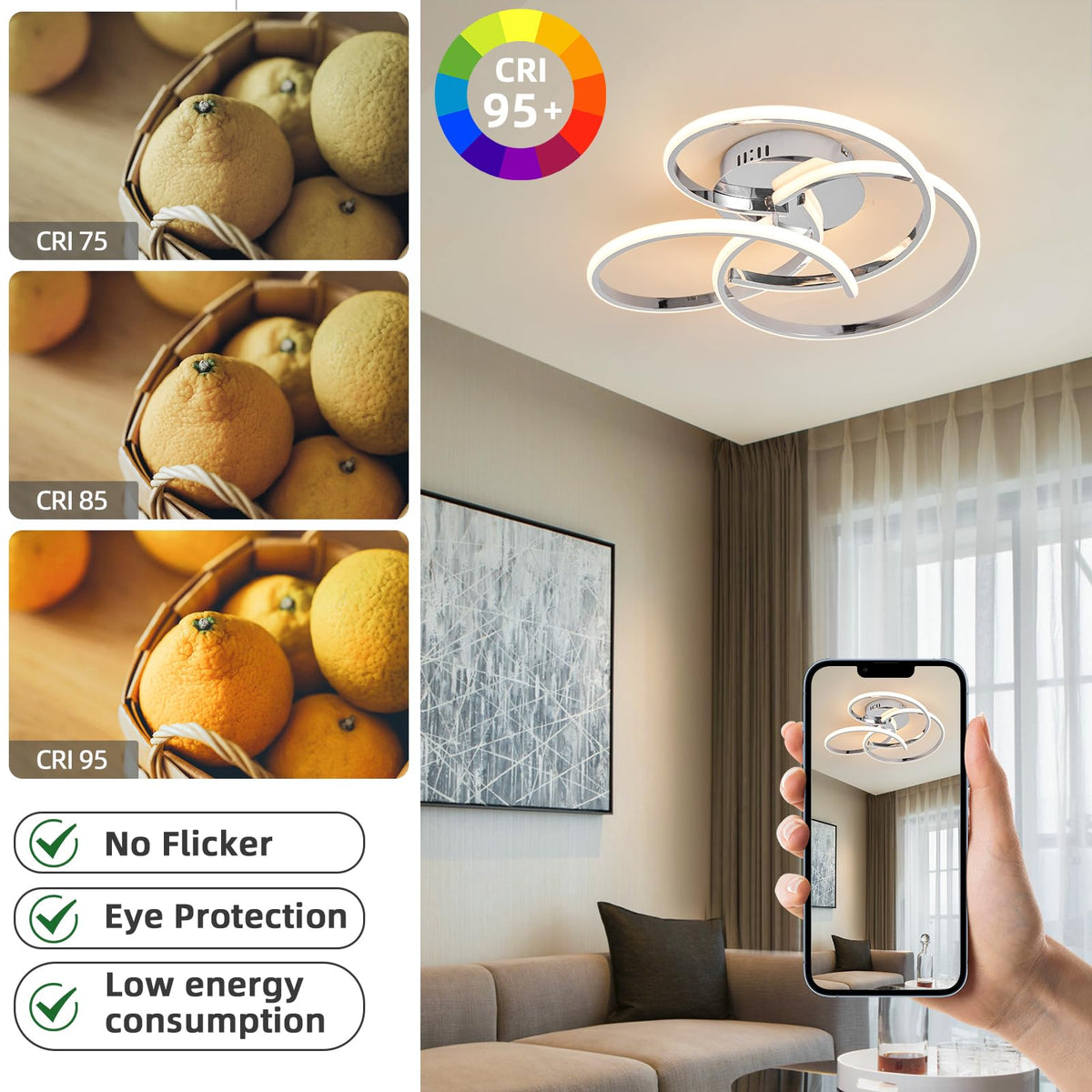 This ceiling light features a sleek chrome body that complements modern decor. Its creative flower design adds an artistic touch while providing effective illumination. The integrated LED light source is not only energy-efficient but also offers adjustable brightness and color temperature for personalized lighting experiences. With a lumen output of 3360lm and a power rating of 42W, this fixture delivers bright and efficient lighting suitable for a wide range of applications.
