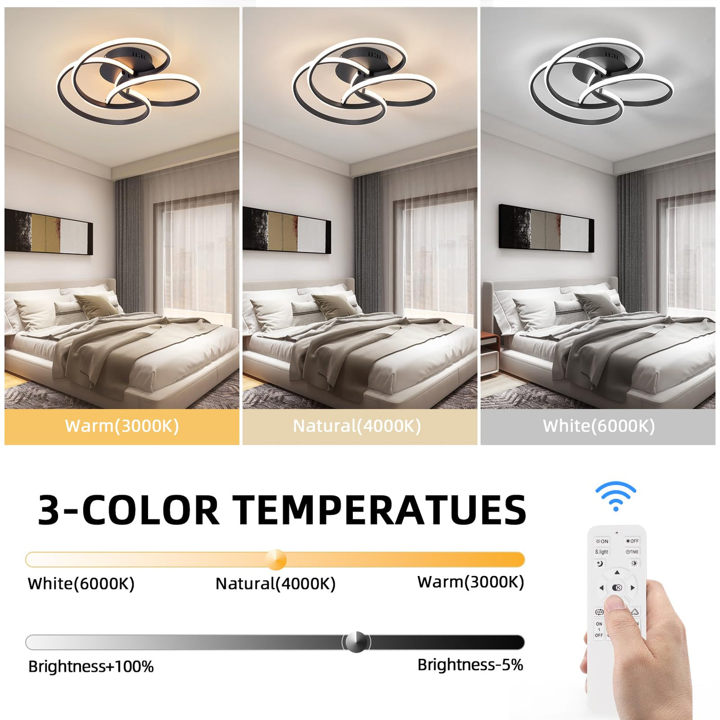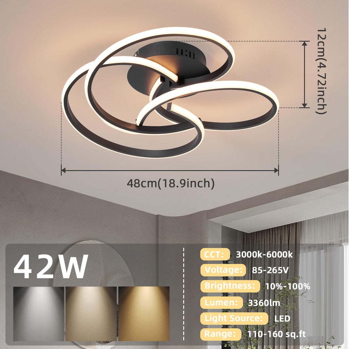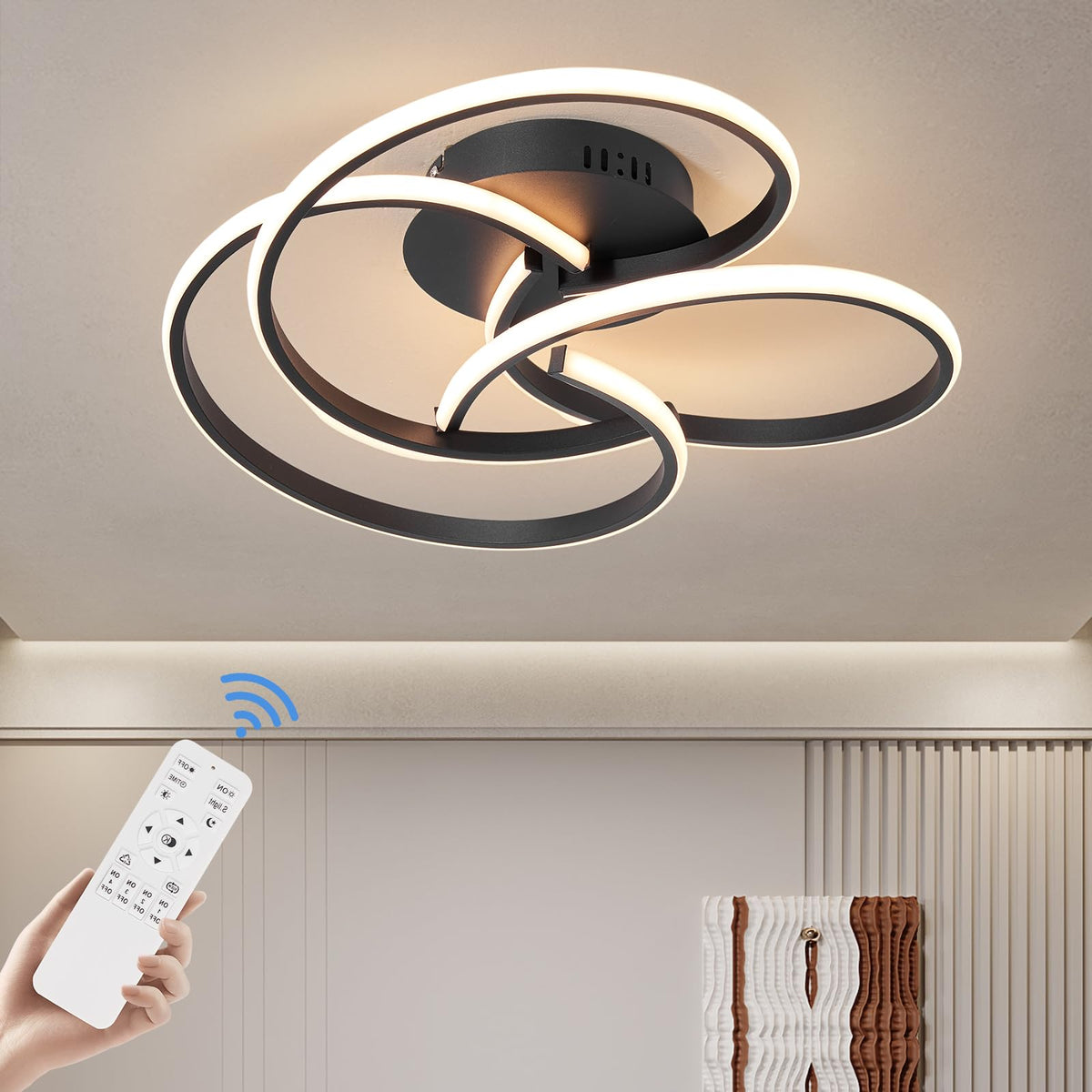 CANEOE Modern LED Ceiling Light Fixture, 42W Dimmable, Remote Control, Black, Flush Mount, Model CL-3BH-D-US