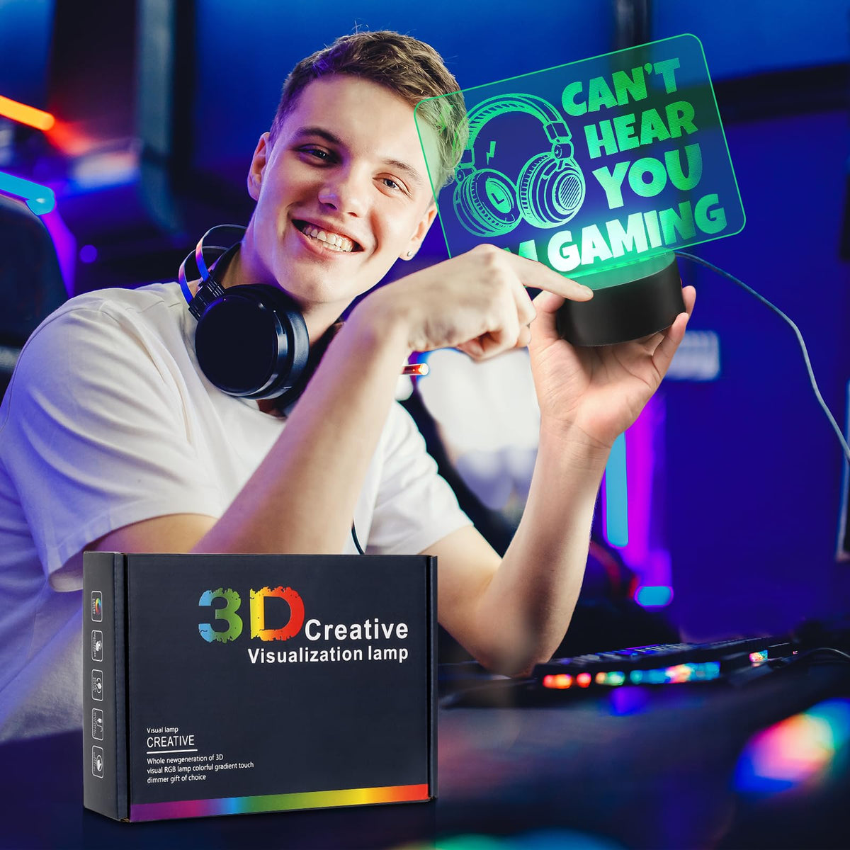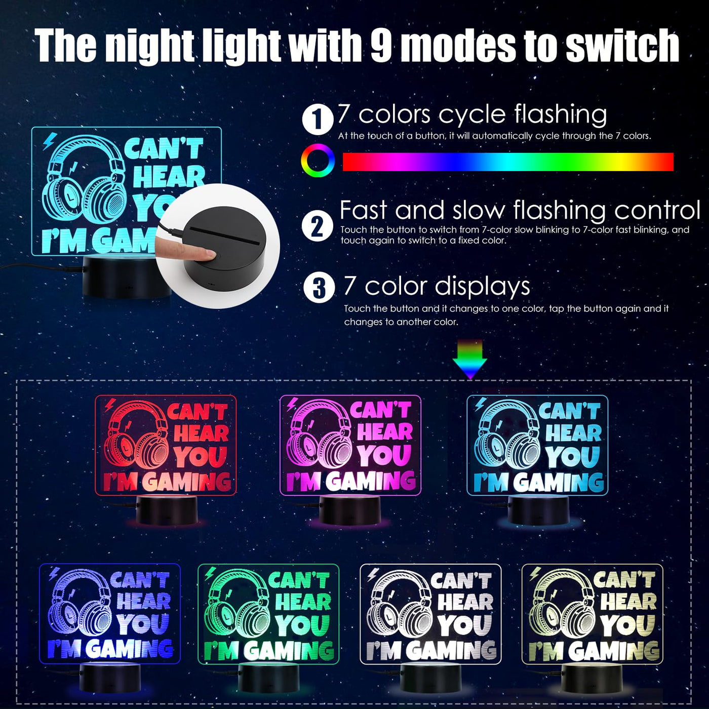 Cool 3D illusion effect gamer night light with 7 Color Changing mode can be used for gaming room/ bedroom decor. Idea gift for boys/teenagers/men birthday gifts, Christmas gifts for kids. Send him this heartwarming gamer gift to teenager kid boy boyfriend dad or friends on birthday, Christmas,valentine's Day or Easter gifts. Gaming Night Light Gamer Gifts Features: Cool 3D Illusion Effect: show up the pattern of game handset and Words''CAN'T HEAR YOU I'M GAMING'' when it light up, provide children with a dynamic gaming space. 9 Light Modes Gamer Gifts: 7 constant light mode (White/Red/Green/Purple/Yellow/Purple/Blue) and 2 flash light mode(fast mode and slow flash mode), you can touch the switch button to change the mode. Super cool gifts for boys/teenagers/men/boyfriend. Soft,Colorful and safe Gaming Night Light Gift: colorful light inspires kids' imagination,soft light help kids to overcome the fear of darkness and have a better sleep,safe acrylic can be touched freely even it lighted up. CAN'T HEAR YOU I'M GAMING: great decor for gaming room, desk, bedroom to show your personality,both children and even adults will be happy to get this cool night light gamer gift! Gaming Night Light Gamer Gifts Details: Material: Acrylic board and TPU base Product Size: 7.28 x 6.89 x Min 0.14 - Max 3.74 inch Light Mode: 9 Light Modes(7 constant light mode+2 flash light mode) 2 Ways Power Supply: USB or 3*AA battery Input Voltage: .5-5V Output Power: 3-4W