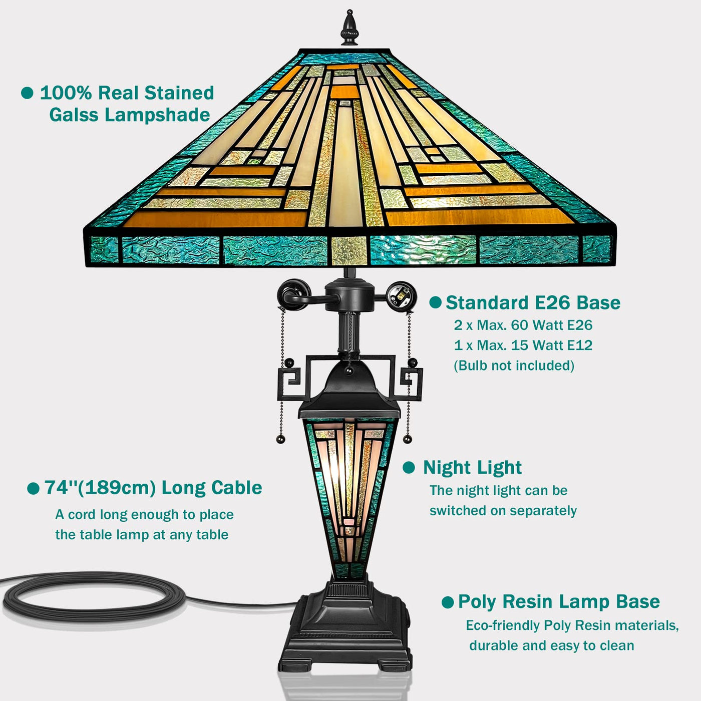 Capulina Large Tiffany Table Lamp 3-Light With Nightlight 16X16X25 Inches Mother-Daughter Vase Mission Green Amber Style Stained Glass Desk Light For Home Living Room Bedroom
