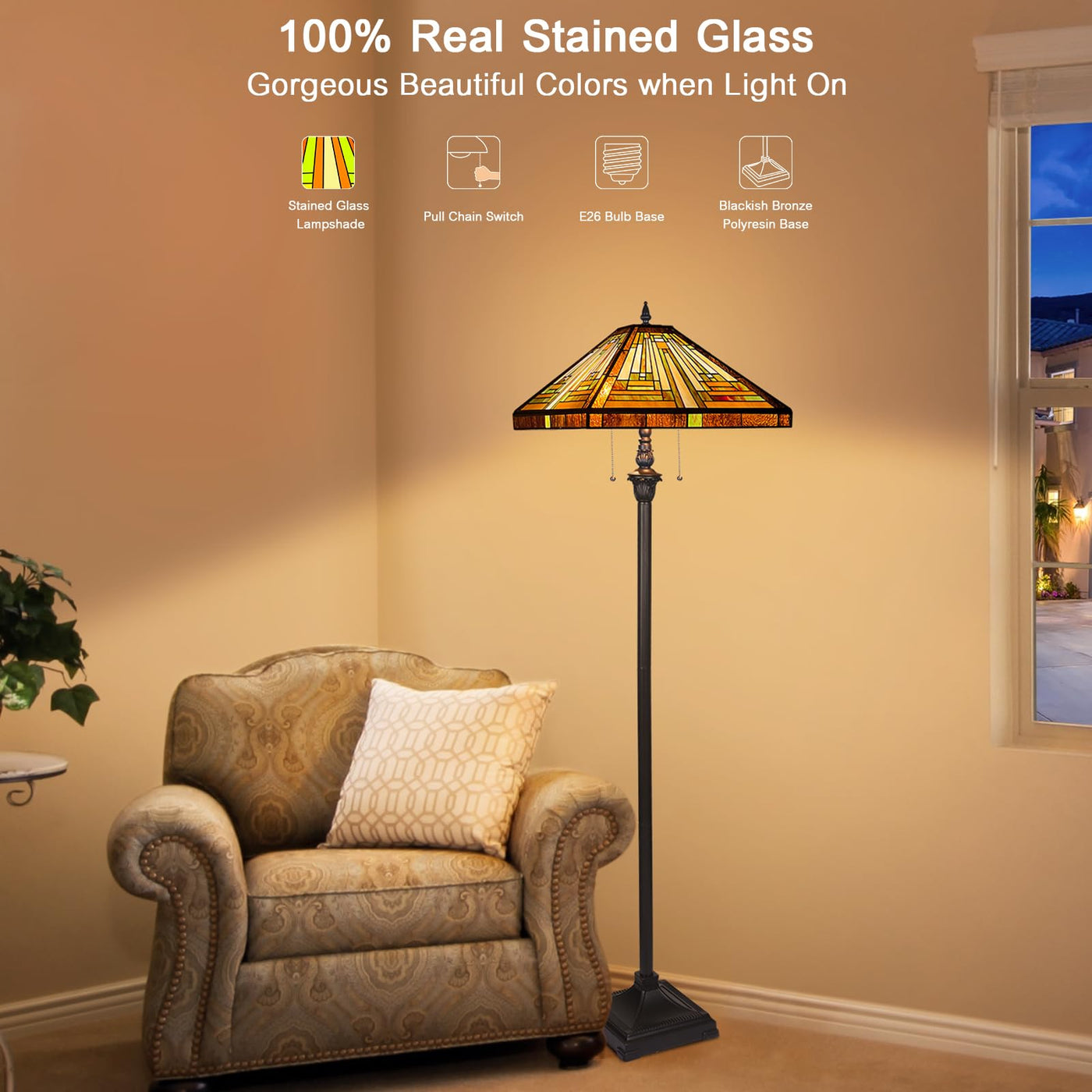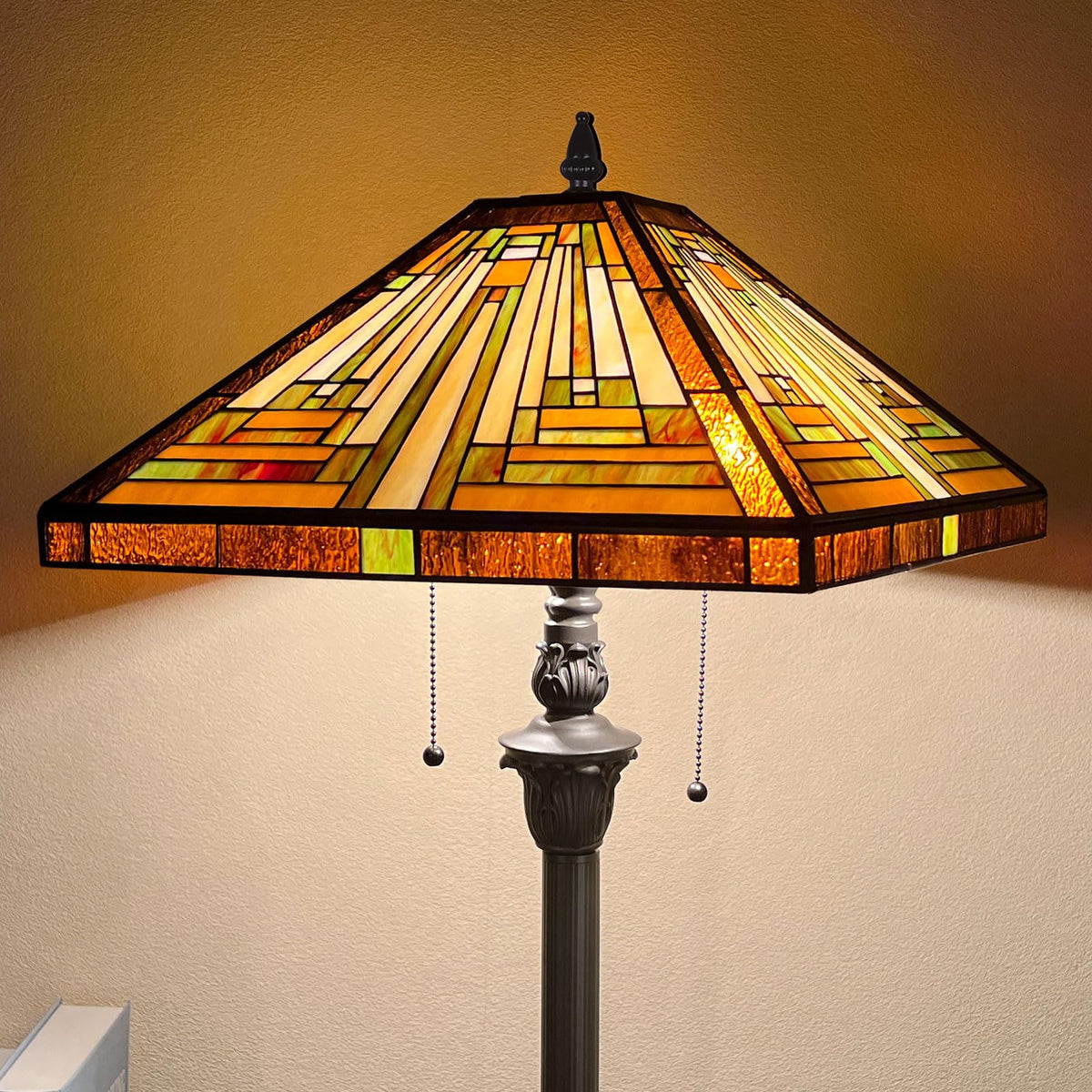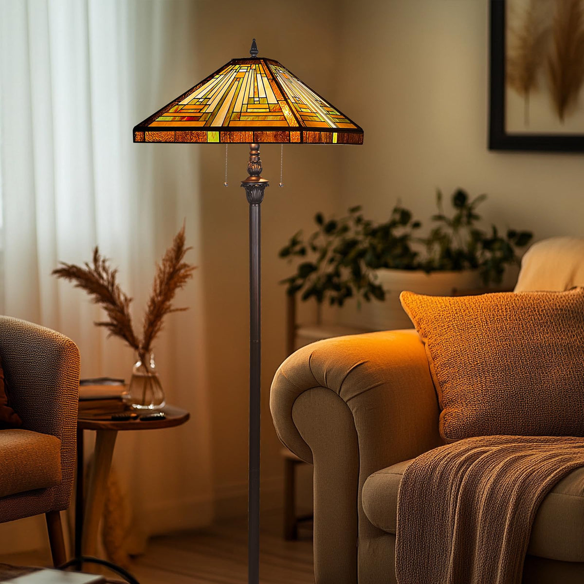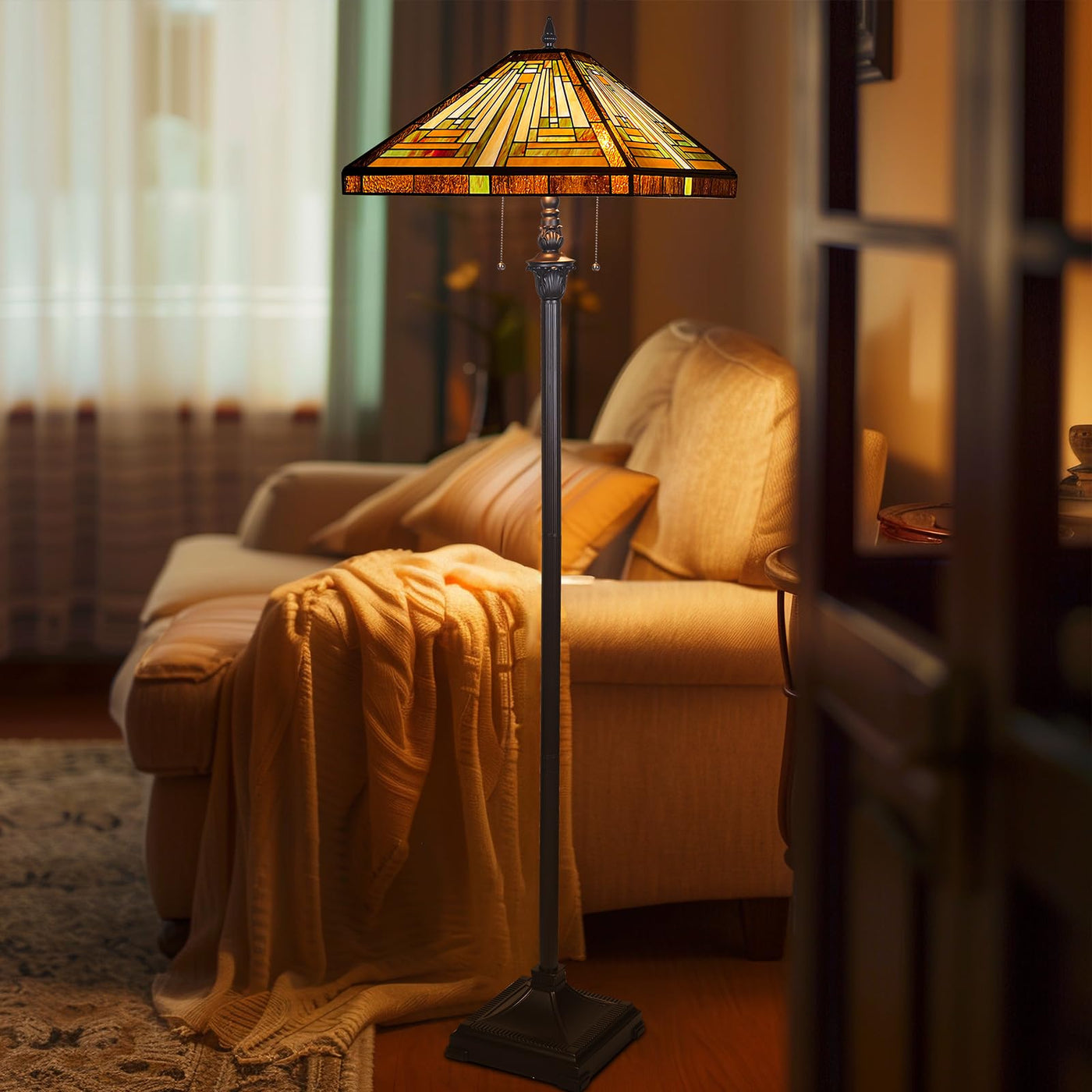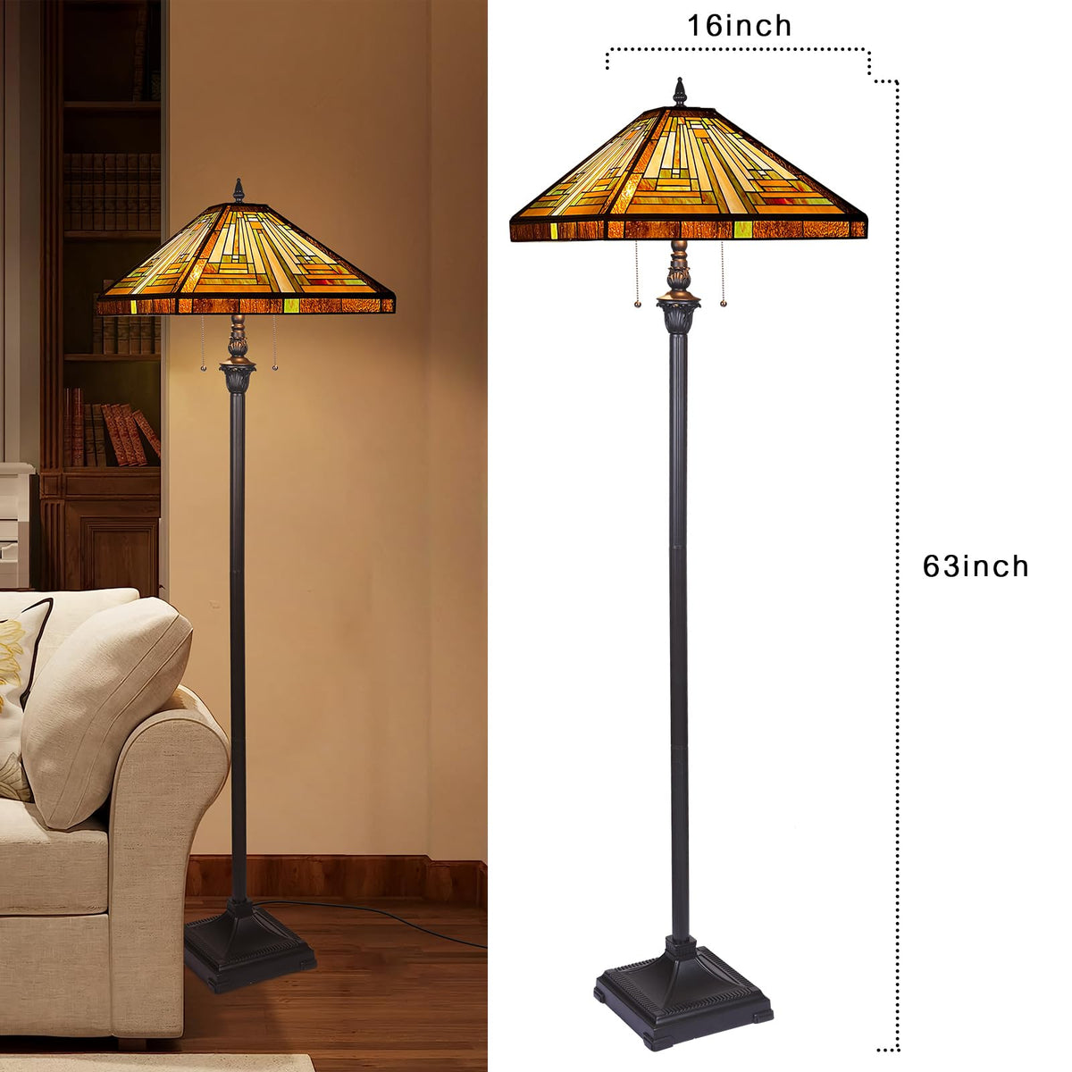 Capulina Tiffany Floor Lamp 2-Light 16X16X63 Inches Amber Brown Mission Antique Style Stained Glass Standing Reading Light For L