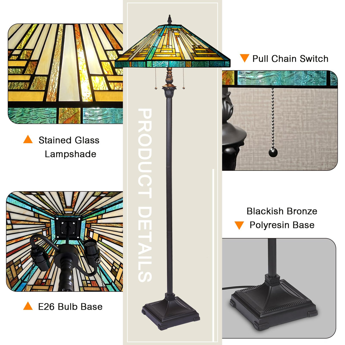 Q: What type of bulbs can be used with this Tiffany floor lamp?A: This Tiffany floor lamp is compatible with incandescent bulbs (maximum E26/60W), LED 2700k warm white lights, or CFL warm white bulbs. Please note that bulbs are not included with the lamp.