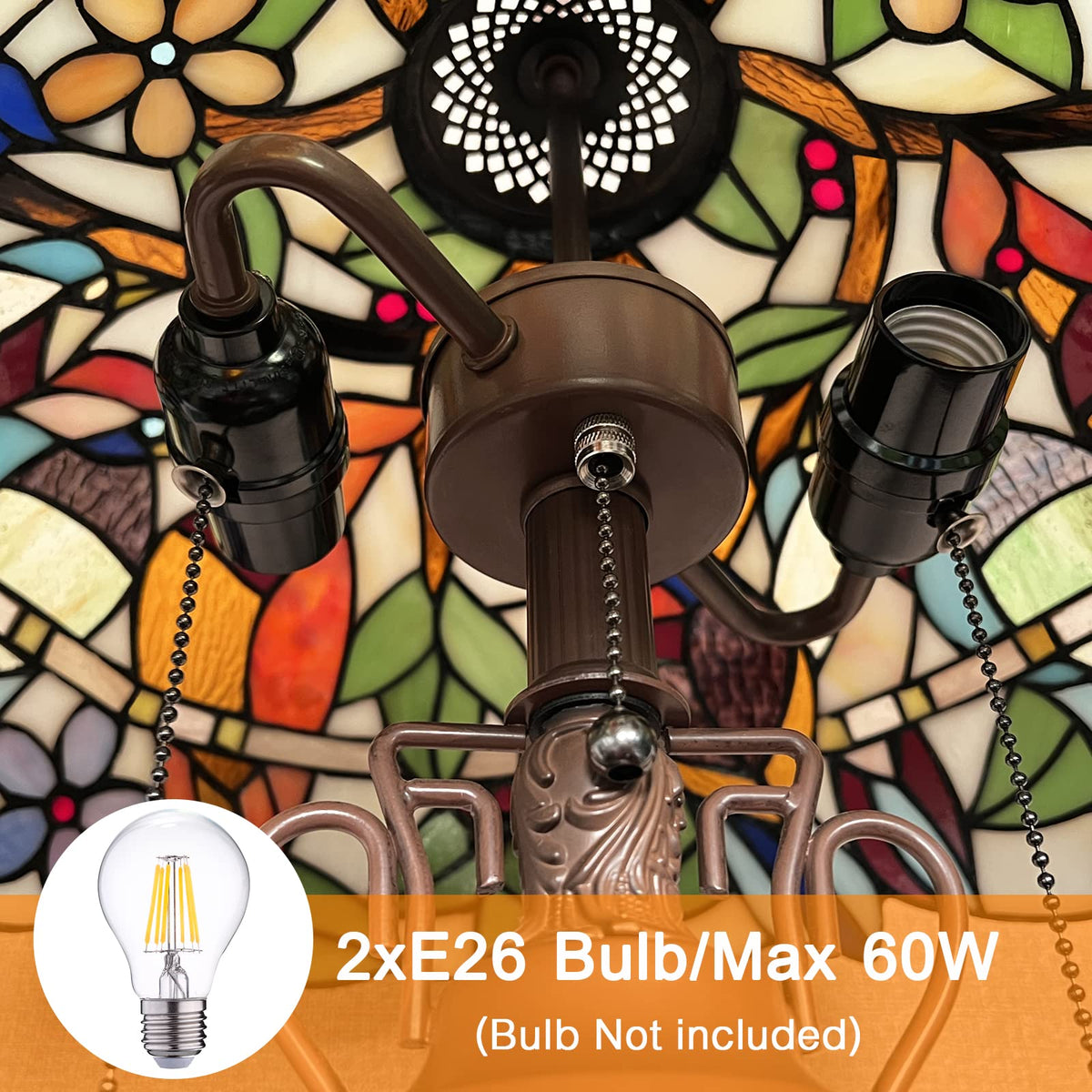 Q: What type of bulbs are compatible with the Capulina Tiffany Table Lamp?A: The Capulina Tiffany Table Lamp is compatible with incandescent bulbs (Max.E26/60W), LED 2700k warm white lights, and CFL warm white bulbs. Different bulb types can create varying lighting effects, enhancing the vibrant colors of the stained glass when lit.