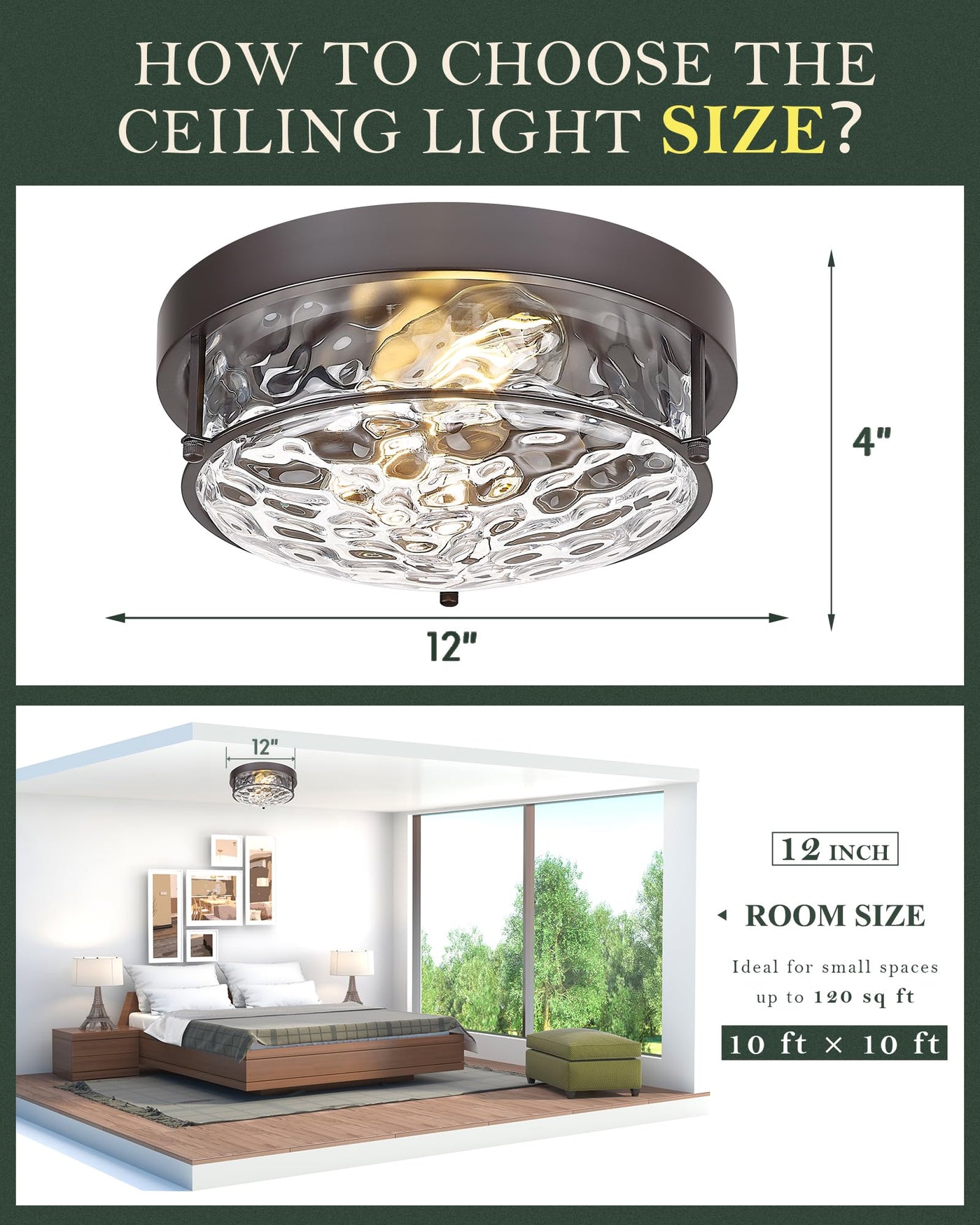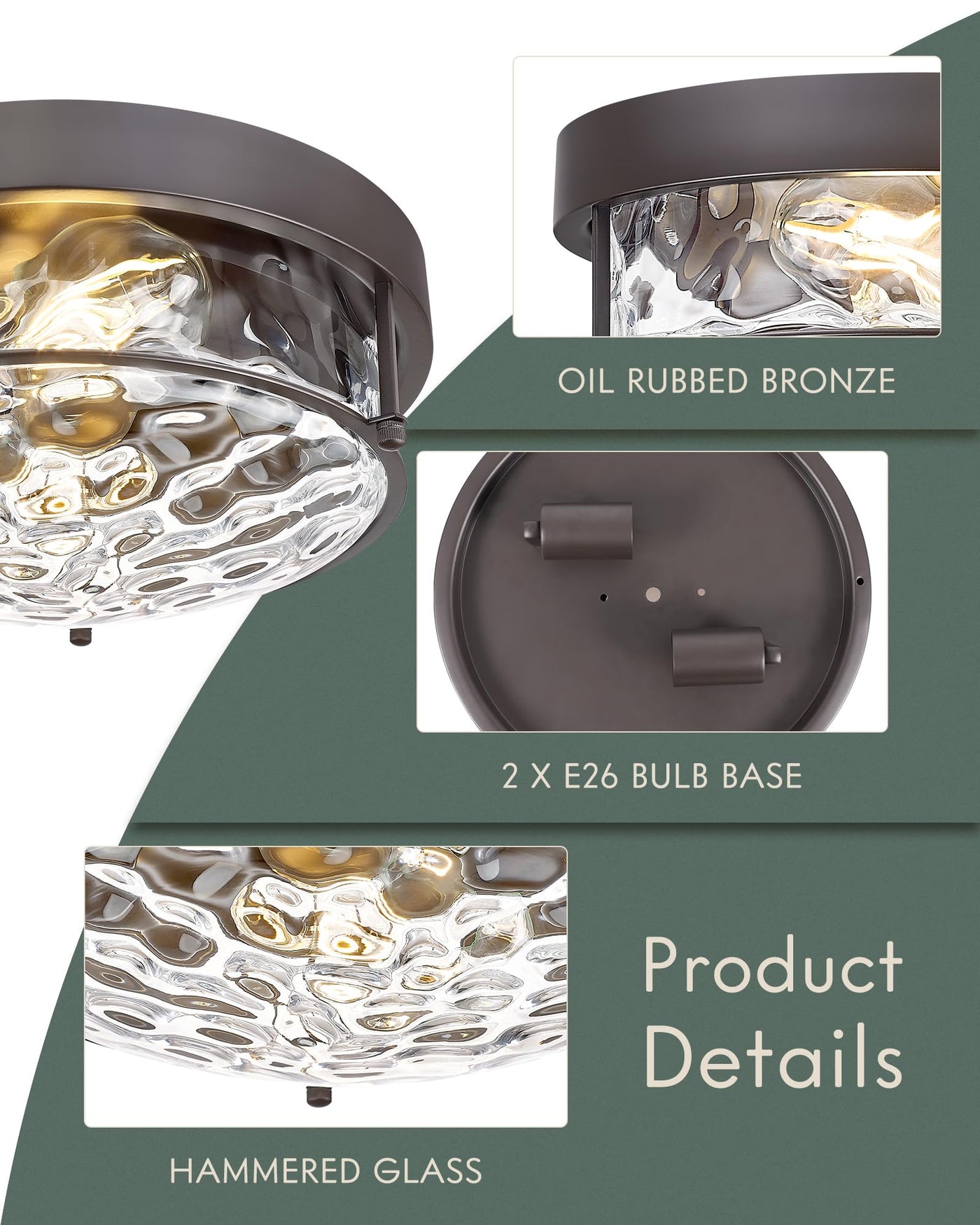 The 12 inch flush mount ceiling light features a handcrafted design with a hammered glass shade, giving it a unique visual texture. Its sleek, low-profile design measures 12in x 12in x 4in, making it suitable for areas with standard or low ceilings. Constructed from durable metal, this fixture is designed to accommodate two E26 base bulbs (max 60W each, not included), offering flexibility to use LED or Edison-style bulbs for your preferred lighting ambiance. The combination of hammered glass and oil-rubbed bronze finish adds a touch of rustic warmth to your decor.