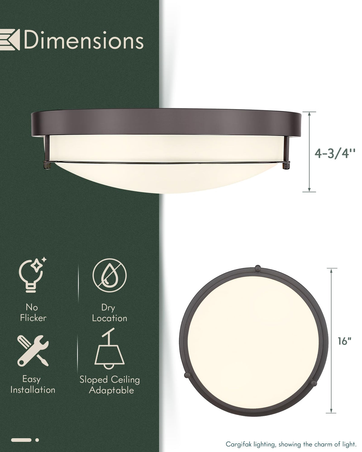 Q: What materials are used in the Cargifak ceiling light fixture?A: The Cargifak 16 inch Flush Mount Ceiling Light is constructed from a high-quality metal frame and features frosted glass, ensuring durability and a non-glare lighting experience.