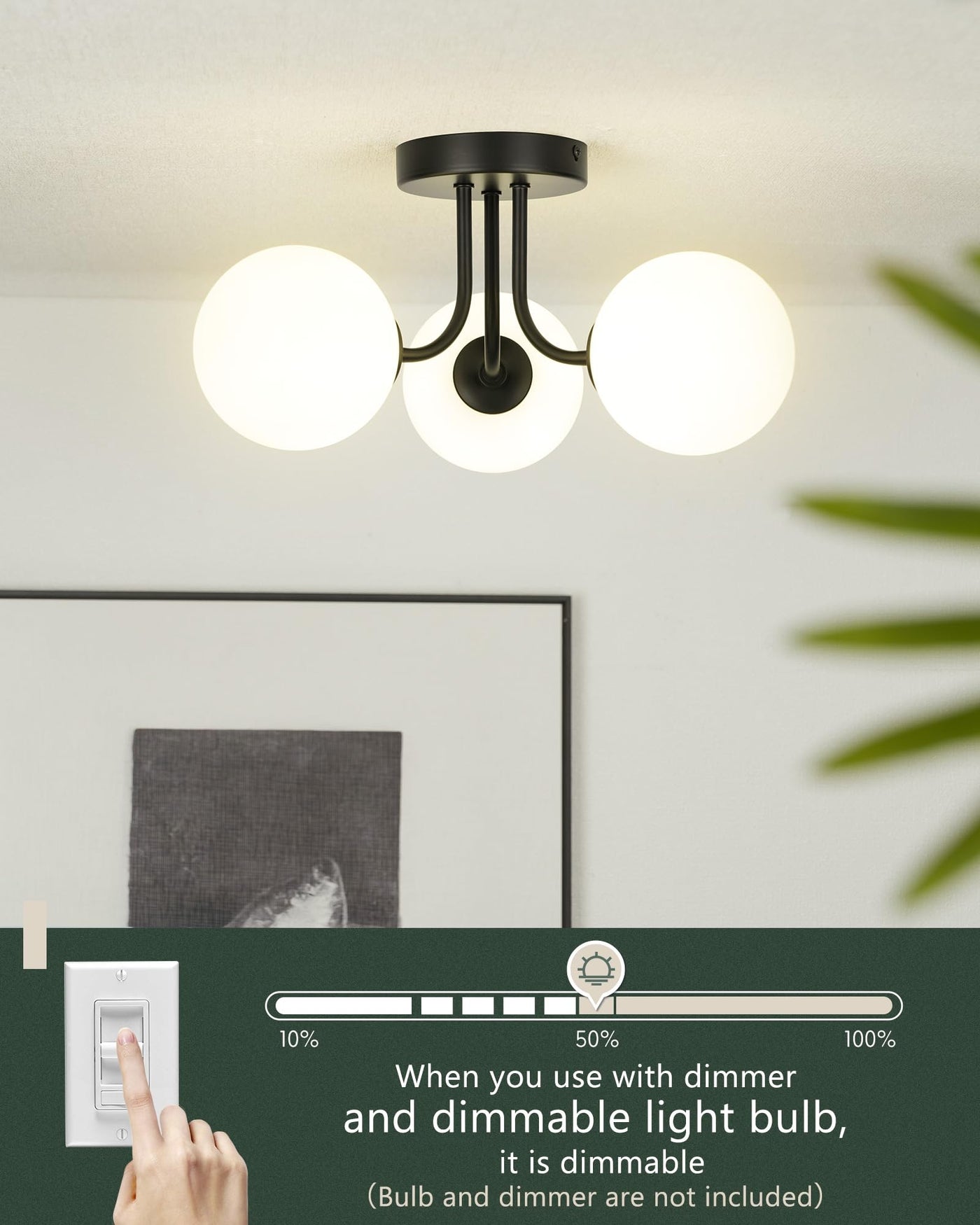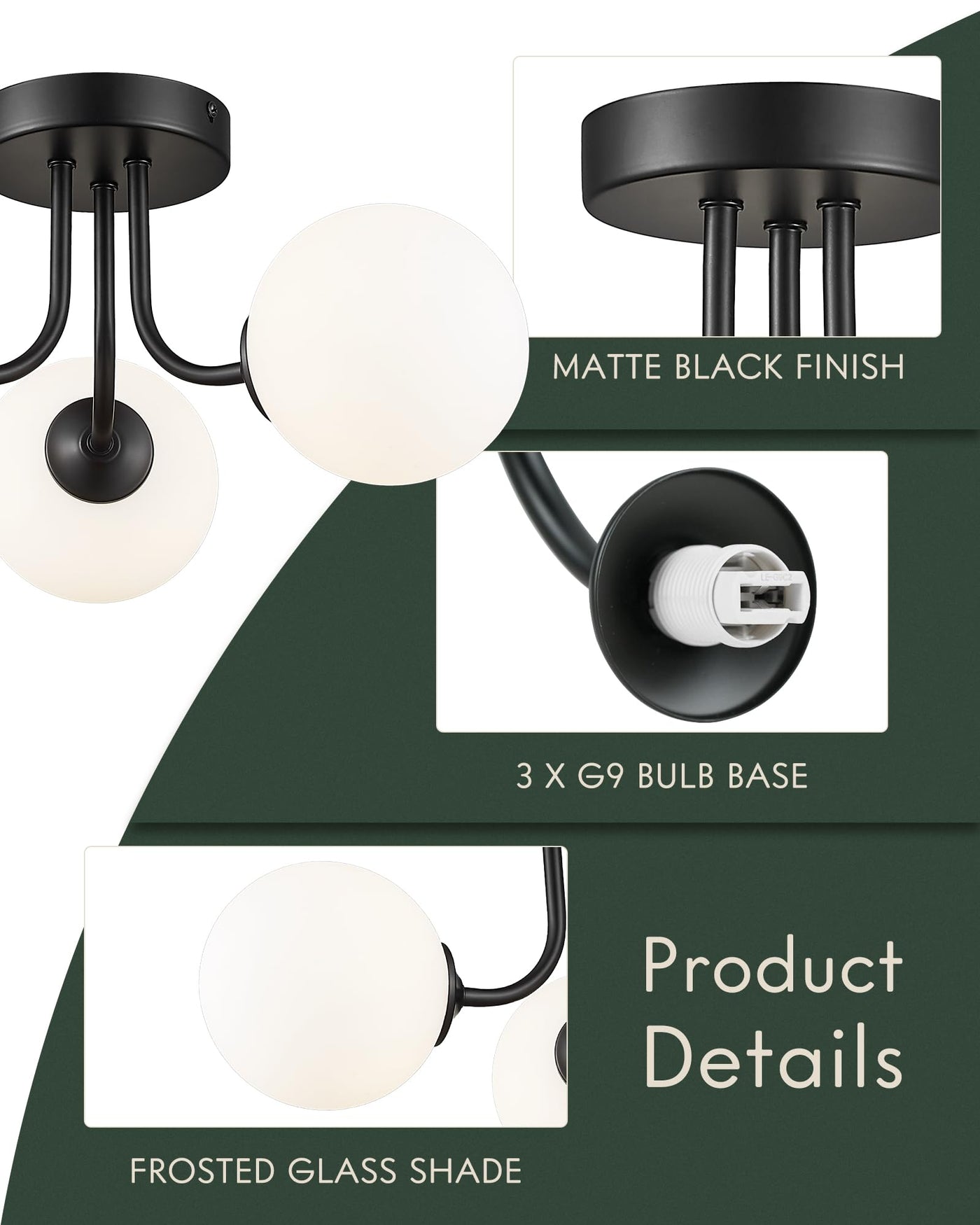 Description: This Ceiling Lights For Bedroom Illuminates Your Home In A Simple And Modern Style. Wear-Resistant Metal With A Stylish Matte Black Finish, This Ceiling Light Fixtures Flush Mount Strikes Globe Silhouette Featuring Smooth Edges. The White Frosted Glass Dome Lampshade Is Fixed In A Slender Metal Frame. Built-In 3 X G9 Bulb Bases, Compatible With Up To 60W Bulbs. Adopt Three Bulbs Design Can Better Diffuse The Light, Make The Lighting Range Larger And More Uniform, And Provide You With The Joyful Lighting Effect. Features: 1. Modern And Simple Design. The Bathroom Ceiling Light Is Made Of Wear-Resistant Metal Material, Which Is Very Durable. Matte Black Finish, Stylish And Beautiful, Can Match Any Interior Room And Decoration. 2. 3-Light Design. The Kitchen Lights Ceiling Is Embedded With Three G9 Bulb Bases, And Three G9 Bulbs Can Be Installed To Make The Lighting Effect Better. The White Frosted Glass Design Makes The Light More Concentrated And The Light Scattering More Evenly. 3. Widely Application. The Flush Mount Light Are Very Suitable For Living Room, Bedroom, Kitchen, Dining Room, Bathroom, Foyer, Laundry Room, Hallway, Study Room, Powder Room, Etc. Packaged: 1 X Matte Black Finish Ceiling Light 1 X Installation Manual Some Installation Accessories