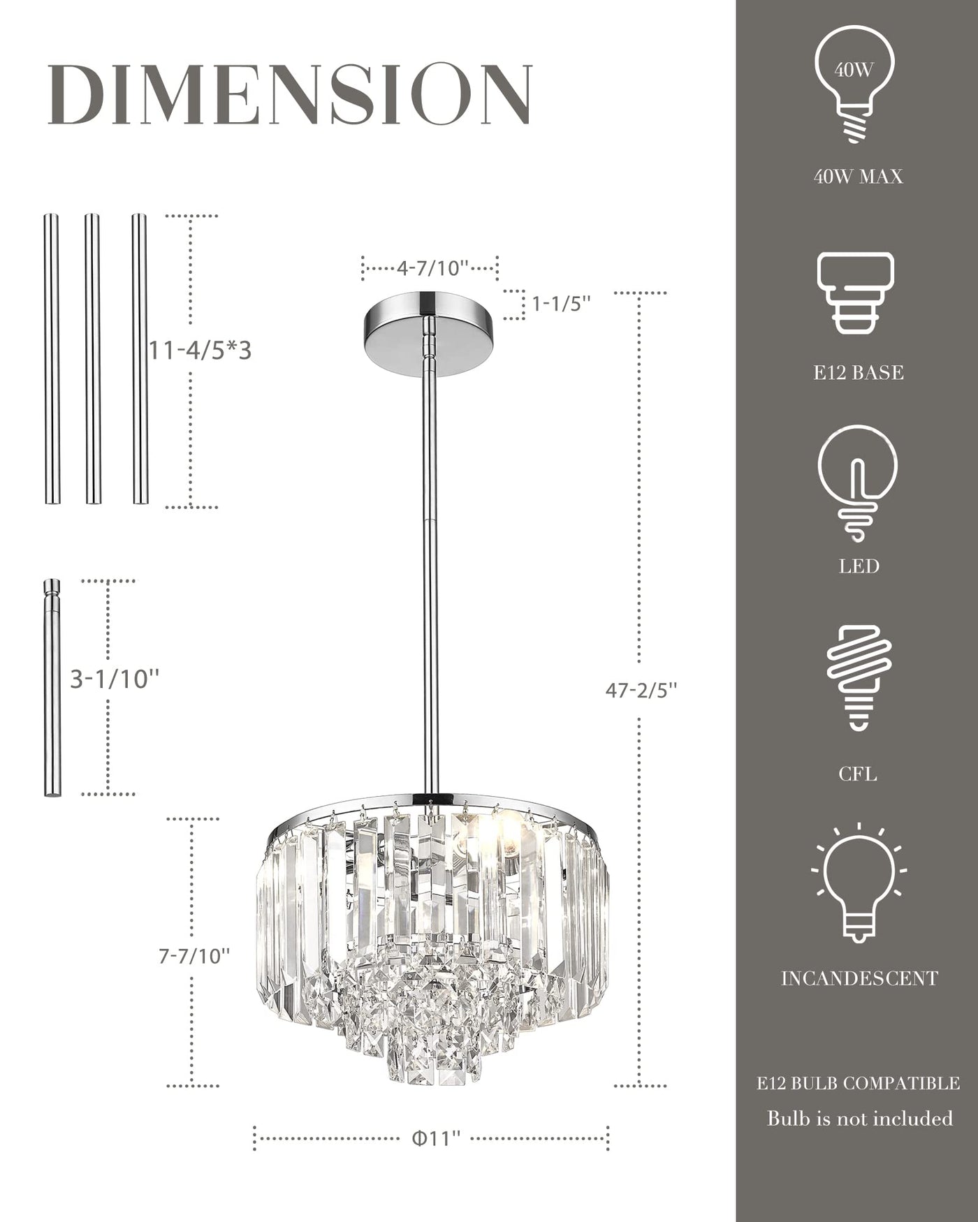 Q: What type of bulbs does the chandelier use?A: The chandelier requires three E12 base bulbs, compatible with LED, CFL, or incandescent bulbs up to forty watts.