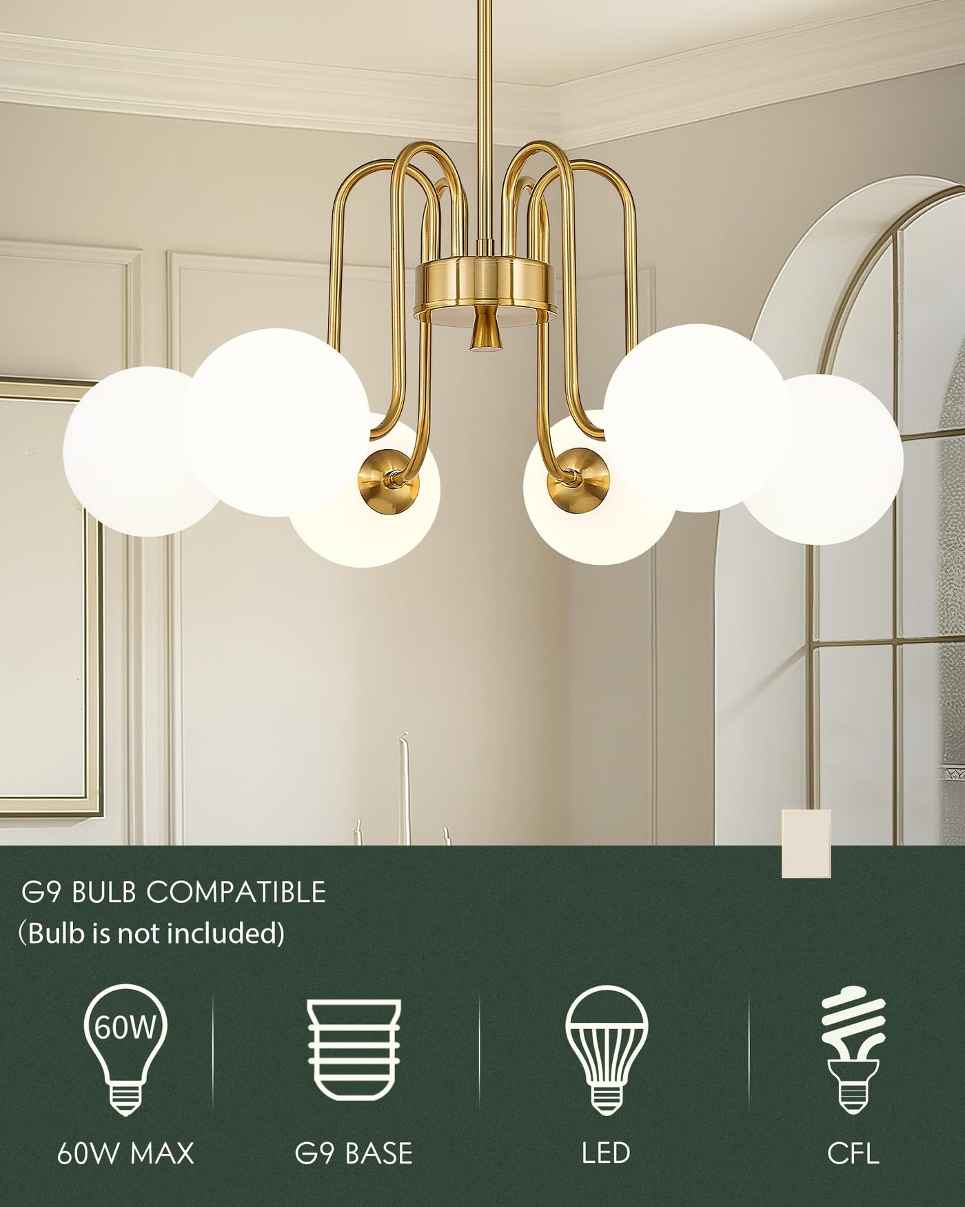 Q: What type of bulbs does this chandelier require?A: The chandelier features six built-in G9 bulb bases. It is compatible with LED, CFL, or Edison bulbs, with a maximum wattage of sixty watts.