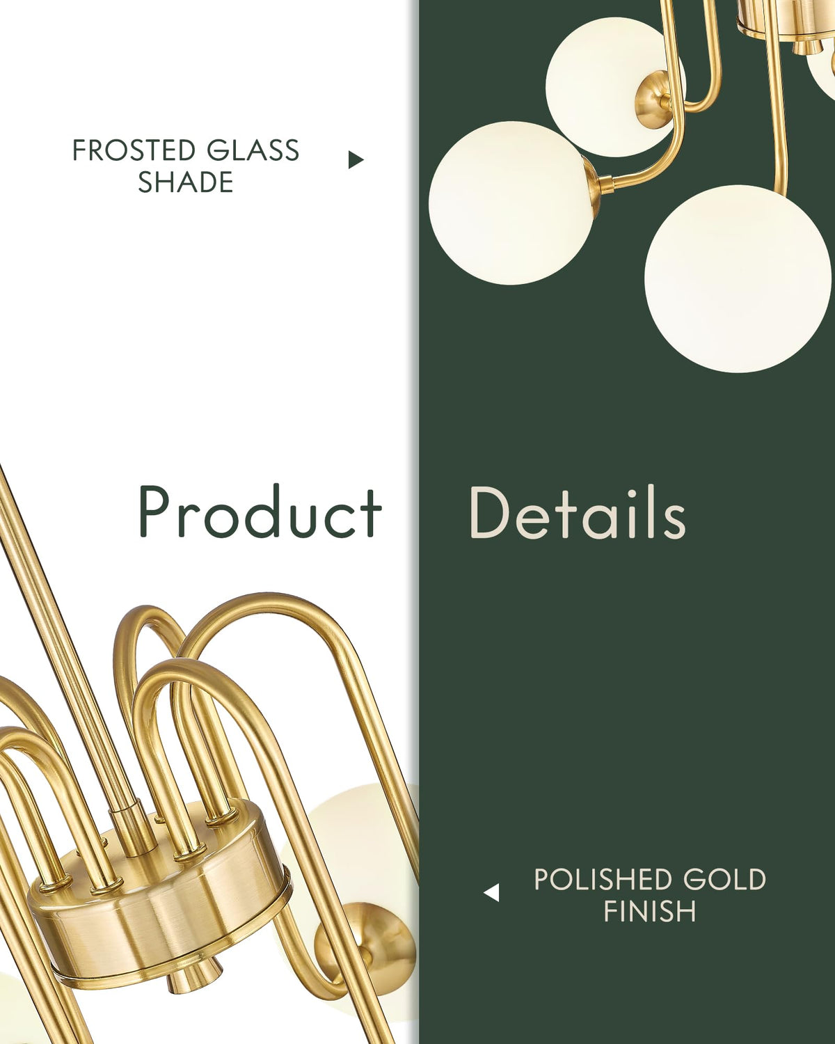 Gold Chandelier with Frosted Glass Globe, 6-Light Modern Pendant Light for Kitchen, Bedroom, Hallway, Living Room,CKPL4845-6P-PG