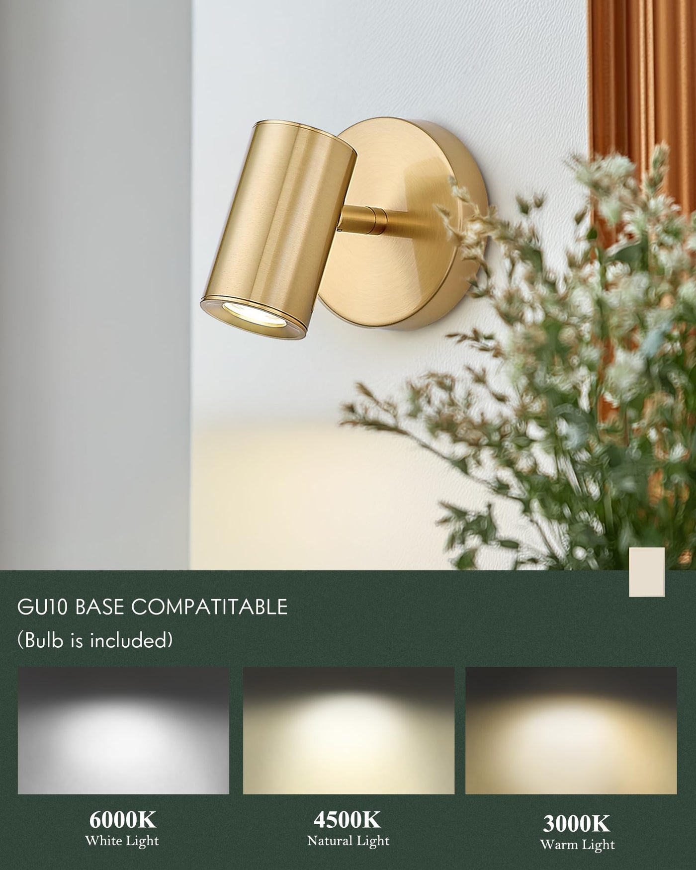- Q: What type of bulb does the Cargifak Gold Wall Sconce require? A: The wall sconce includes one six watt GU10 bulb, which is non-dimmable. This energy-efficient bulb provides a bright ambiance in three color temperatures: three thousand, four thousand, and six thousand five hundred Kelvin.