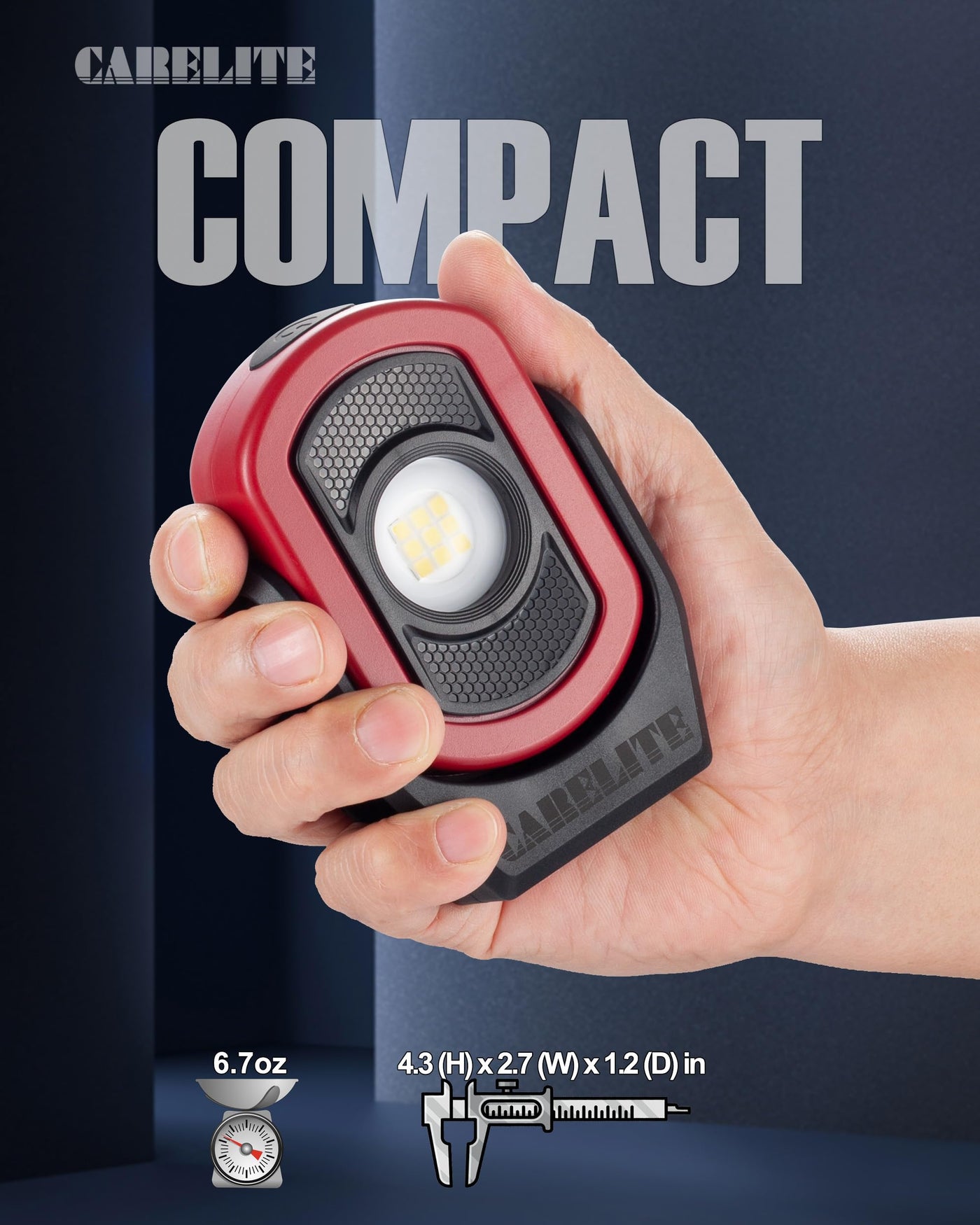 Q: What are the dimensions of the Magnetic Work Light?A: The Magnetic Work Light measures four point three inches in height, two point seven inches in width, and one point two inches in depth.