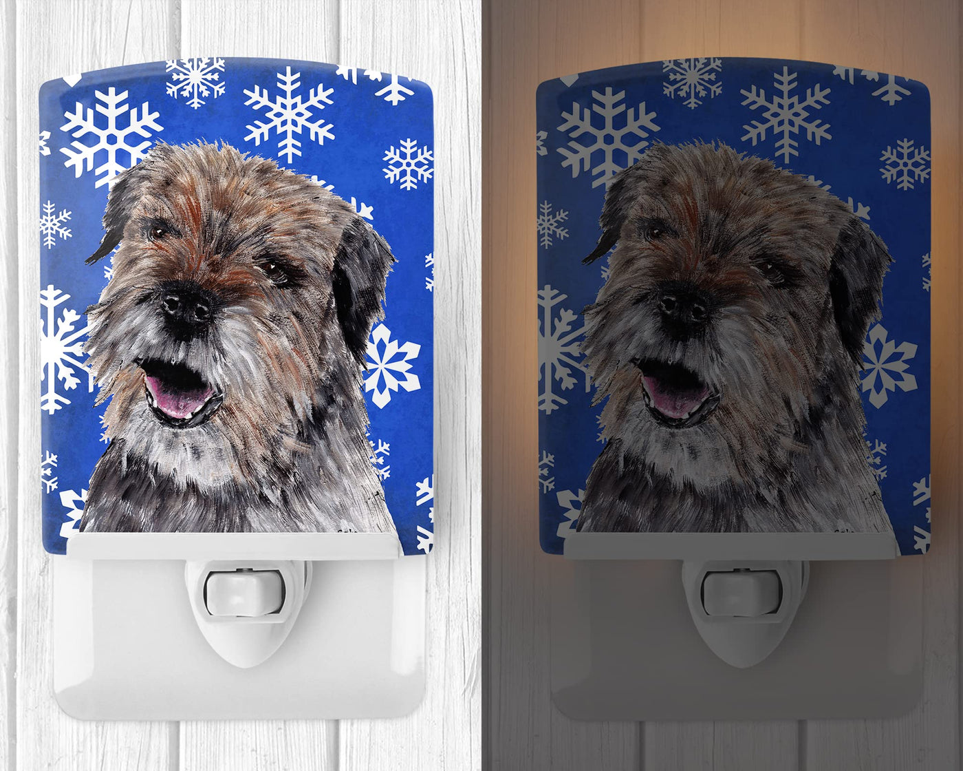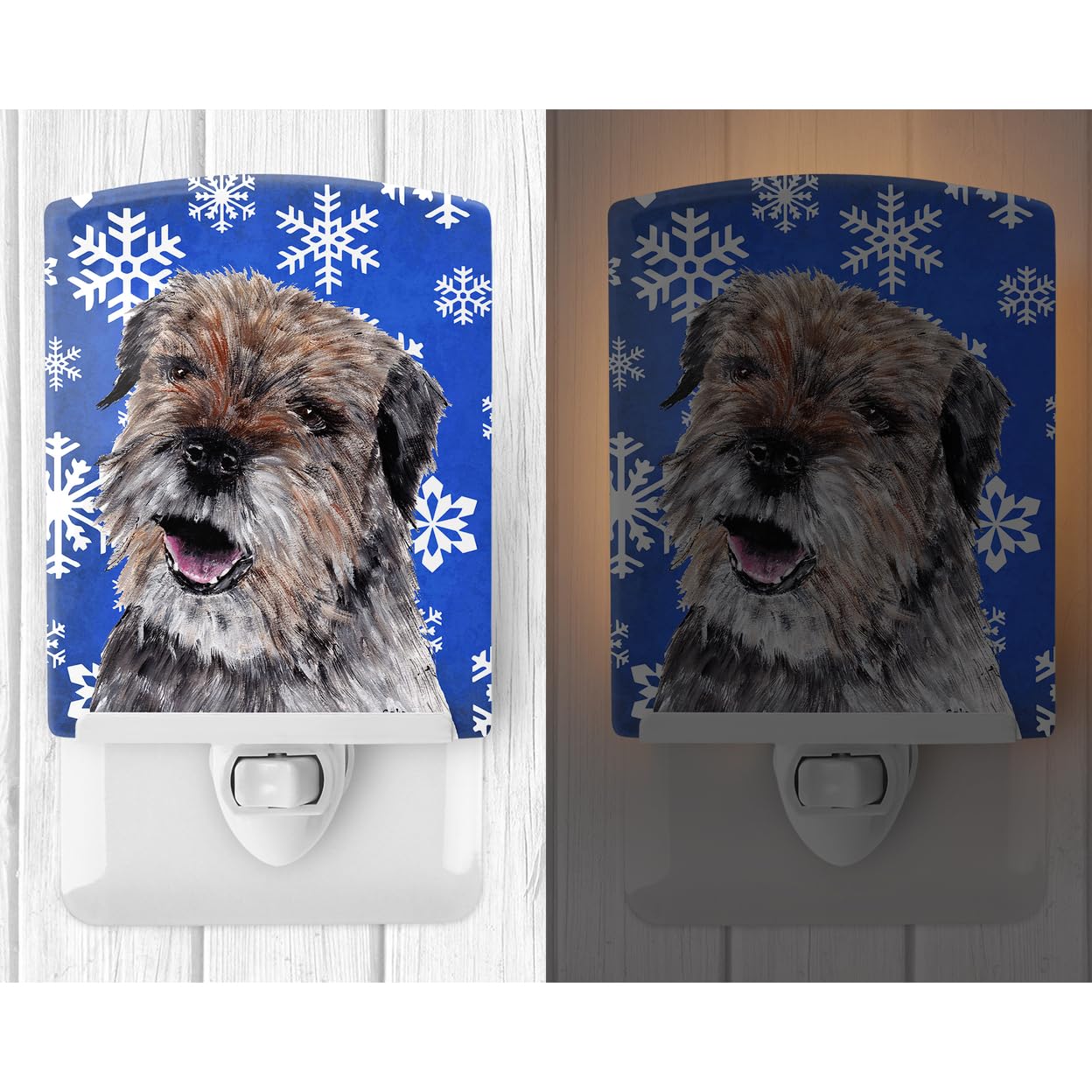 Q: What are the dimensions of the Border Terrier Winter Snowflakes Ceramic Night Light?A: The night light measures 6 inches in height, 4 inches in width, and extends 3 inches deep.
