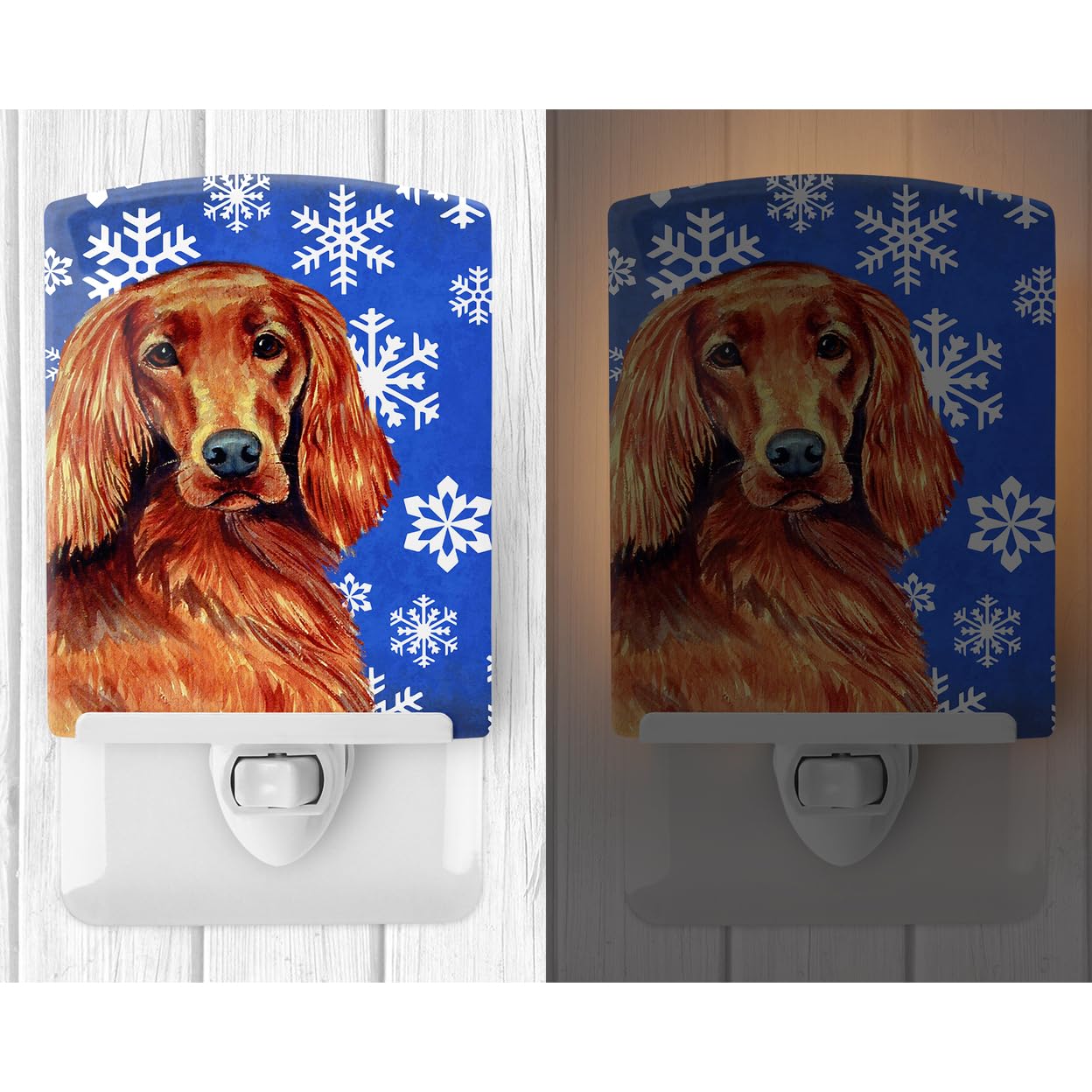 Q: What are the dimensions of the Caroline's Treasures Irish Setter Night Light?A: The night light measures 6 inches high by 4 inches wide and extends 3 inches deep.