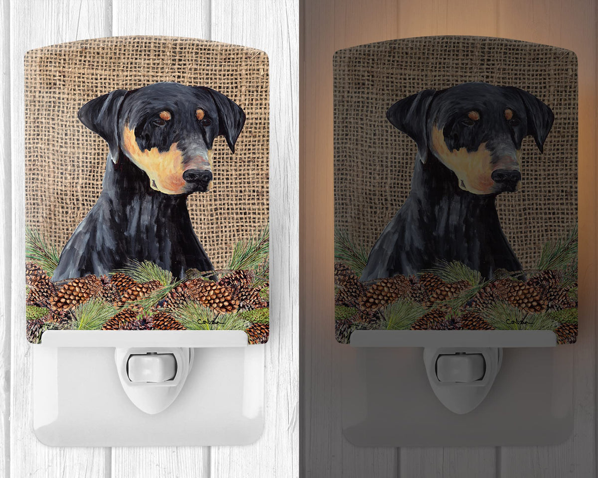 Caroline'S Treasures Sc9038Cnl Doberman Faux Burlap And Pine Cones Ceramic Night Light Compact, Ul-Certified, Ideal For Bedroom, Bathroom, Nursery, Hallway, Kitchen, 6X4X3, Multicolor