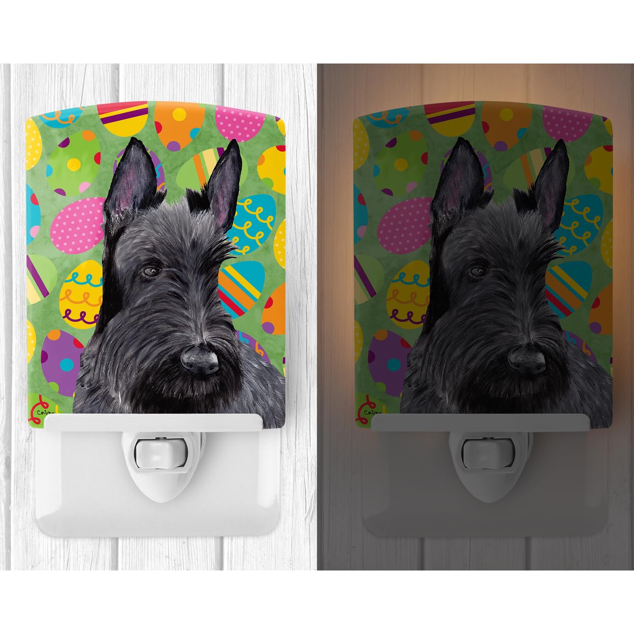 Q: What are the dimensions of the Caroline's Treasures Scottish Terrier Easter Eggtravaganza Ceramic Night Light?A: The night light measures 6 inches in height, 4 inches in width, and extends 3 inches deep.