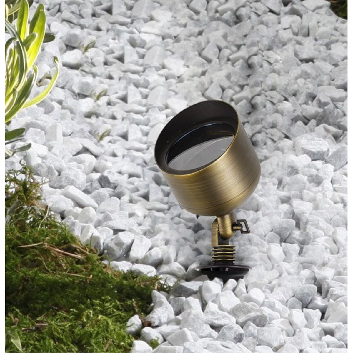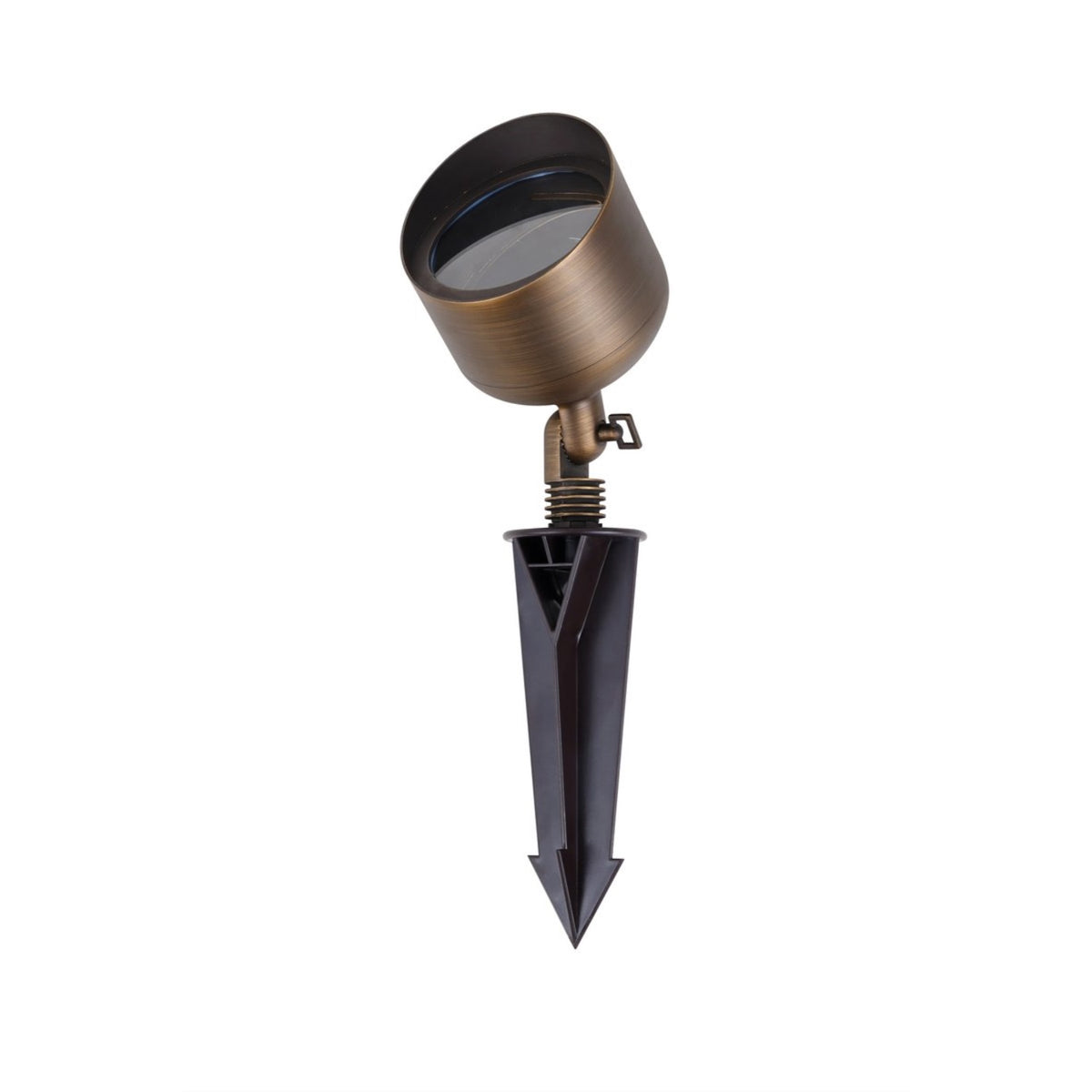 Put the fireflies to shame with Aera collection outdoor landscape spot lights. The round frame is made of die-cast brass with an antique-brass finish and includes a large eight-inch spike for stability. The clear glass lens magnifies the power of the recommended 36-watt Par36 halogen lamp (bulb not included). Unit comes with three feet of wire.