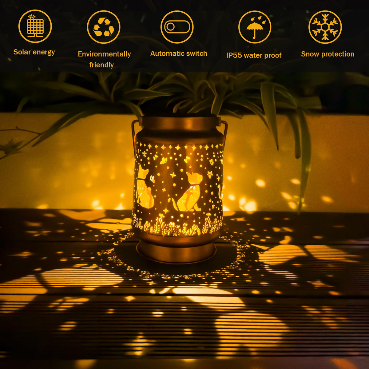 Q: Are these solar lanterns waterproof?A: Yes, the Cat Solar Lanterns are IP65 waterproof, meaning they are crafted from sturdy metal and premium ABS material with a protective anti-rust coating. They are designed to withstand various weather conditions, including rain and snow, ensuring long-lasting performance.