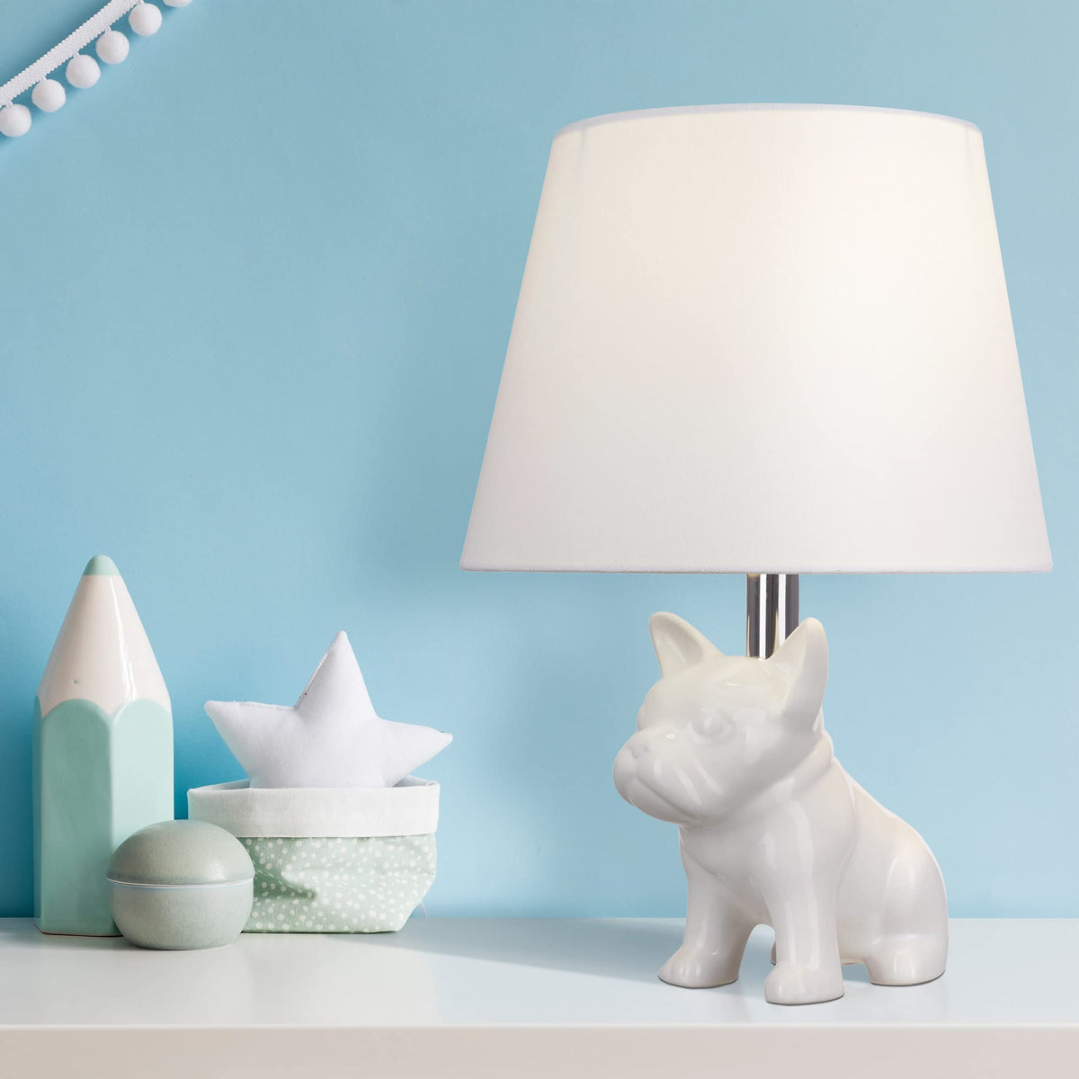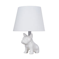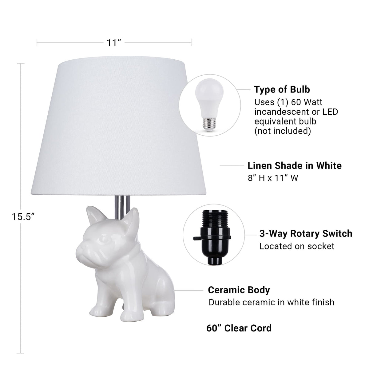 Here is a novelty lamp that knows how to sit, stay, and brighten any space. Featuring a ceramic French bulldog figure sitting charmingly under a white shade, this whimsical accent lamp provides ample ambient light. This lamp features a white linen shade and an on/off switch on socket with a 60'' clear power cord. A compact design makes it the perfect bedside companion or darling addition to the dorm, kids room, living room or office workspace. LED Bulb NOT Included.