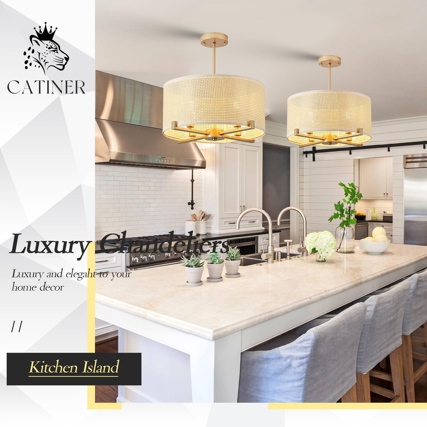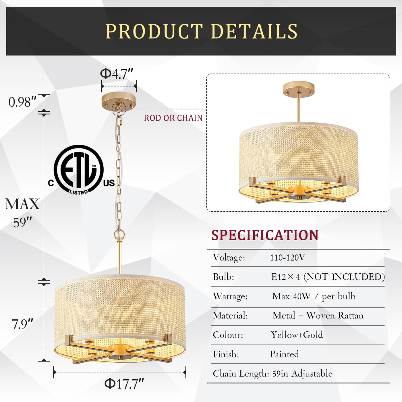 Drum Chandelier: Uses Premium Hand-Woven Rattan With Antique Finish Metal Arms, Combined Together Makes The Drum Light Fixture Very Modern And Vintage,Simple Design But Will Never Out Of Date, High Quality Woven Rattan Of This Drum Chandelier Matches Your Statement Home Deco, Very High-End And Luxurious Boho Design Easy Installation: Includes Detailed Installation Manual, You Will Only Need To Connect The Metal Branch Into Round Shape Then Connect With The Hand-Woven Rattan Shade, If You Need To The Clean The Lampshade, Please Use Dry Towel To Clean It Dimension: This Boho Ceiling Pendant Light Fixture Is D17.7 H7.9 With Adjustable Chain Height Max To 59 And It Requires 4 E12 Light Bulbs(Not Included) In 40W Max For Each Bulb, Easily Adjust The Height To Adapt Different Ceiling, High Ceiling Or Lower Ceiling, You Can Also Install It As Pendant Lighting Or Semi Flush Mount Chandelier Wide Applications: This Drum Semi Flush Mount Chandelier Will Adapt Your Various Places, Dining Room Kitchen Island Foyer Entryway Home Office Living Room Bedroom And So On, Use Different Color Temperature Light Bulbs(Not Included)Will Gives Different Ambience At Your Home Customer Care: High Quality Materials Of This Bohemian Drum Light Fixture, If You Have Any Questions About The Rattan Round Chandelier,Please Feel Free To Contact Us