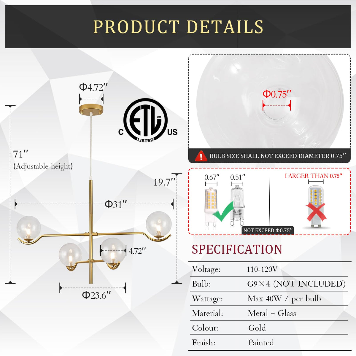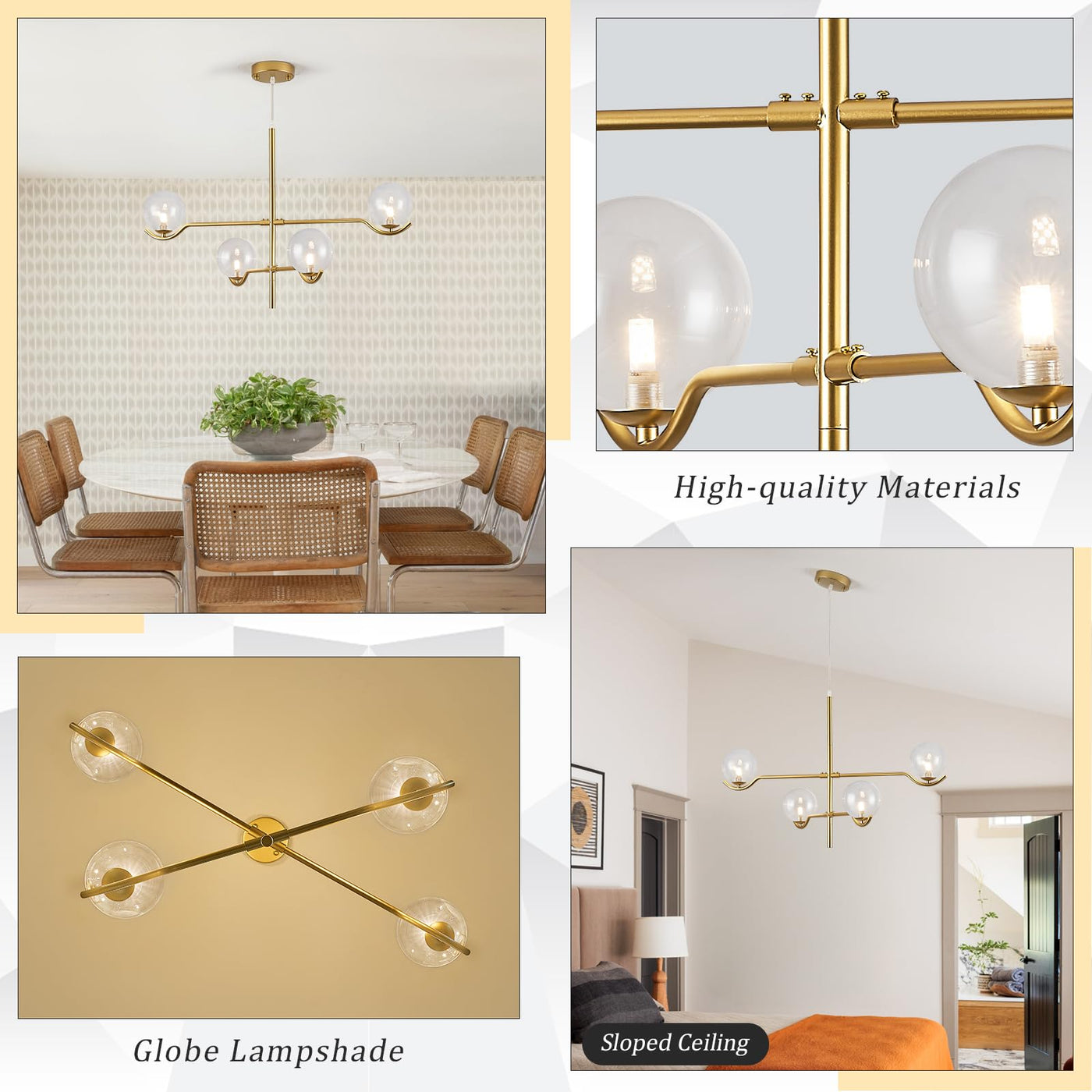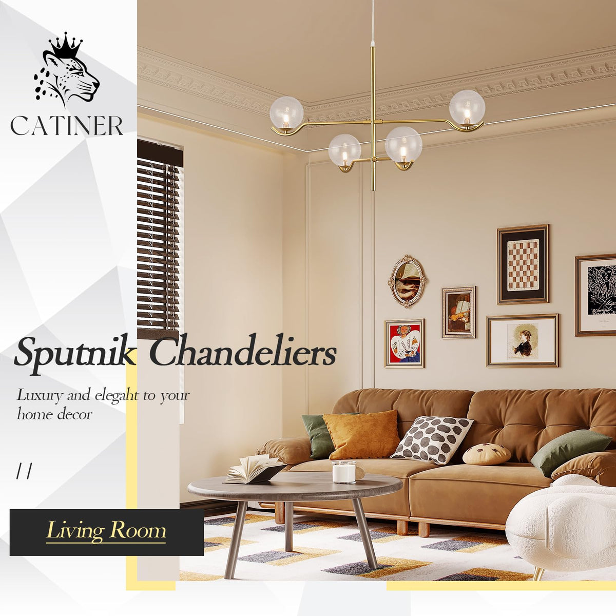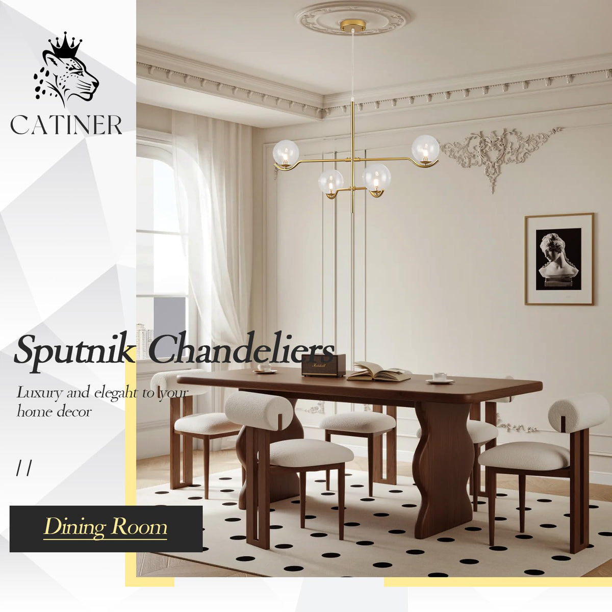 Catiner 4 Lights Gold Sputnik Chandelier, Modern Large L31 '' Mid Century Long Ceiling Pendant Light Fixtures With Clear Glass G