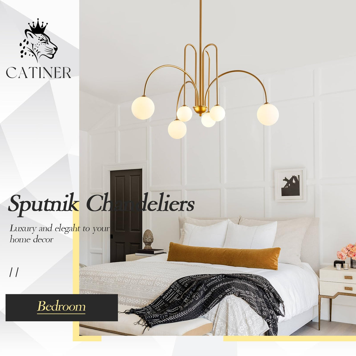 Q: What is the design style of the CATINER Gold Sputnik Chandelier?A: The chandelier showcases a modern and mid-century design, featuring six textured milk white glass lampshades and stylish curves, adding a contemporary touch to your dining room, foyer, or living space.