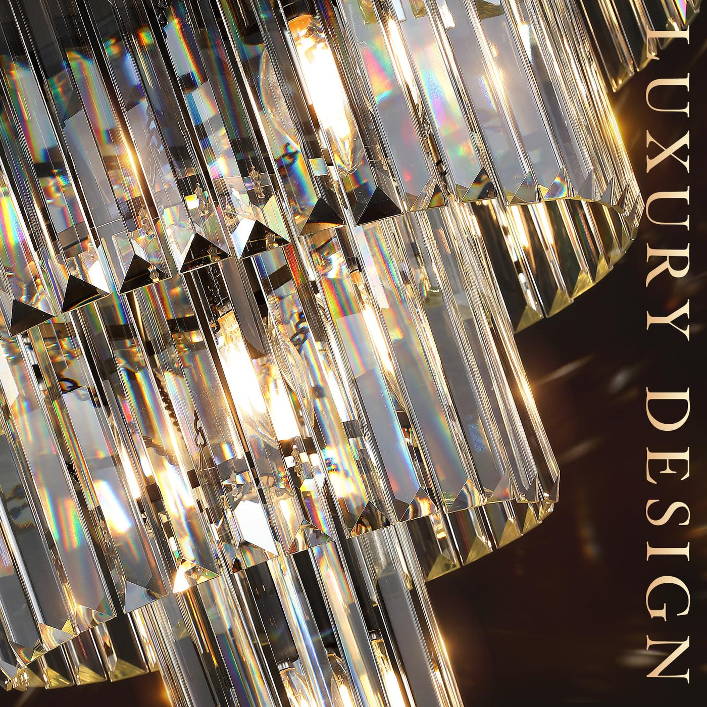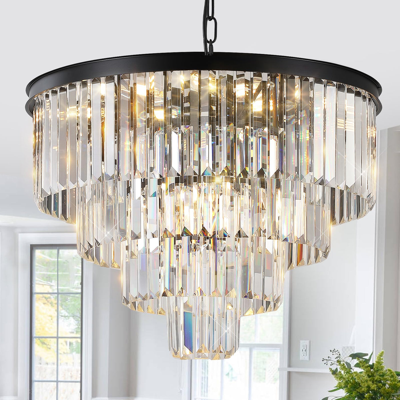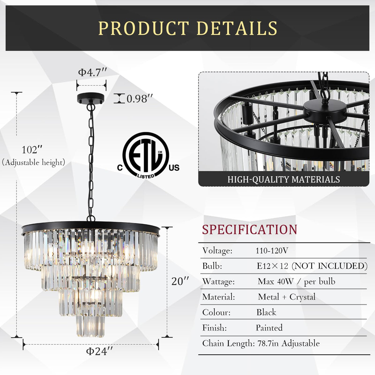 Modern Crystal Chandelier Designed In Round Shape Matte Black Frame, Covered With 4 Tiers Of Top K9 Crystals, Stunning And Sparkling No Matters When You Turn On The Light Or Turn Off The Lights, High Quality Materials That Not Easily Get Rusted And Easy To Clean,Classic Design That Brings You The Modern And Elegant Looks To Enhance Your Home Decor Black Crystal Chandeleir Is Height Adjustable,You Can Hang This Light Fixture As Semi Flush Mount Ceiling Light; Or As Pendant Hanging Light By Adjusting The Length Of Chain, Perfectly Fit To Your High Ceiling Or Lower Ceiling, Capable For Sloped Ceiling,You Will See The Beautiful Lighting Effect On The Ceiling When You Turn On The Light Dimension Of This Statement Contemporary Chandelier Is D20.5 H20 With Adjustable Chain Max To 78.7 , Great For High Ceiling Foyer, Staircase And Living Room, It Requires 12 E12 Light Bulbs(Not Included) In 40W Max For Each Bulb, If You Need Dimmable Function Of The Crystal Pendant Lighting, Led Dimmable Light Bulbs And Wall Dimmer Switch Are Needed(Not Included), New Design Of Metal Chain To Connect Each Ring, You Can Also Adjust The Length Of Each Tier Crystals Wide Applications- This Large Round Ceiling Light Fixture Will Adapt Your Various Places, Dining Room,Foyer,Entryway,Staircase,Hallway,Walk-In Closet,Home Office,Kitchen And So On,Use Different Color Temperature Light Bulbs(Not Included)Will Gives Different Ambience At Your Home Customer Care- If You Have Any Questions About The Crystal Light Fixture Please Feel Free To Contact Us!