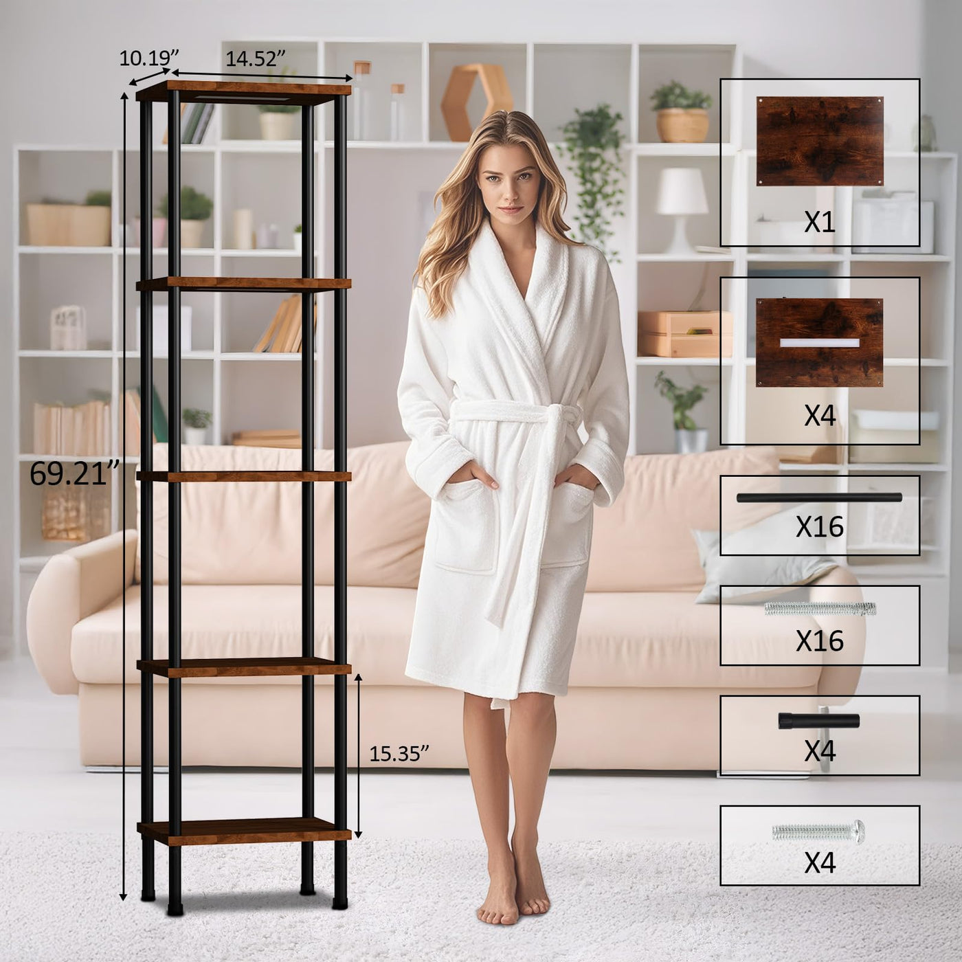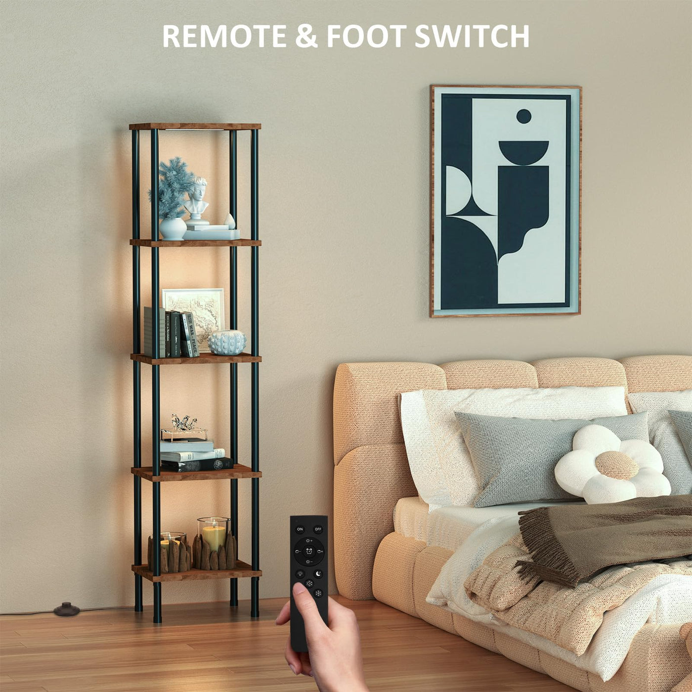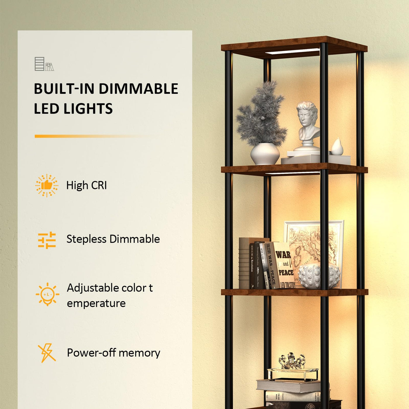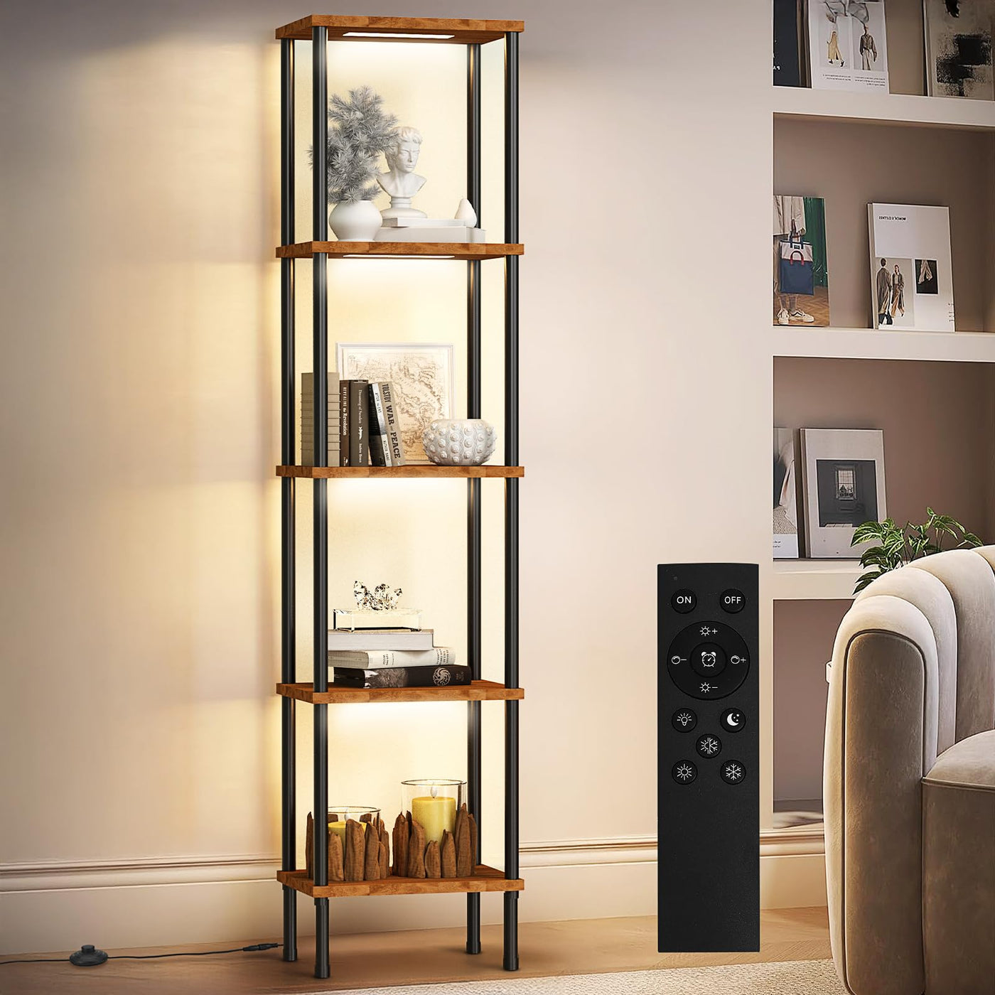 Caupel 5-Tier Display Corner Shelf with Dimmable Lights, 69.21 Inch Tall Bookshelf Storage Rack, Floor Lamp Display Shelves for Small Spaces, Rustic Open Bookcase Square Shelf Tower for Living Room