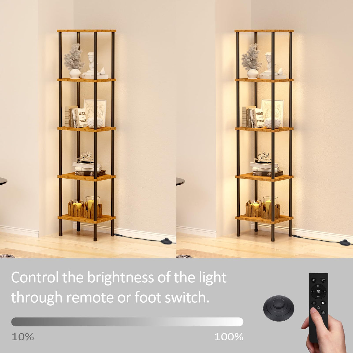 Caupel 5-Tier Display Corner Shelf With Dimmable Lights, 69.21 Inch Tall Bookshelf Storage Rack, Floor Lamp Display Shelves For