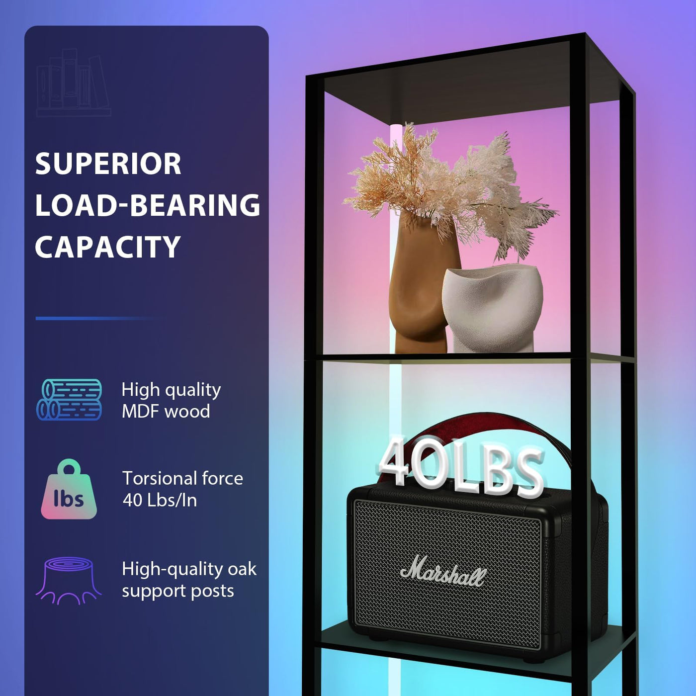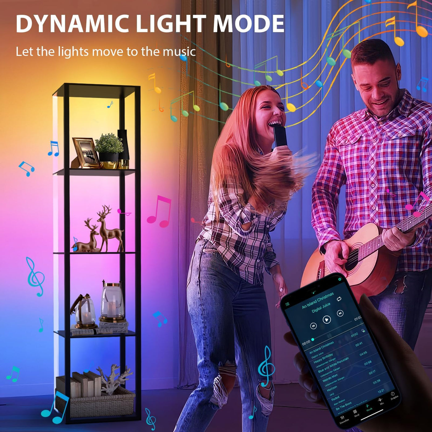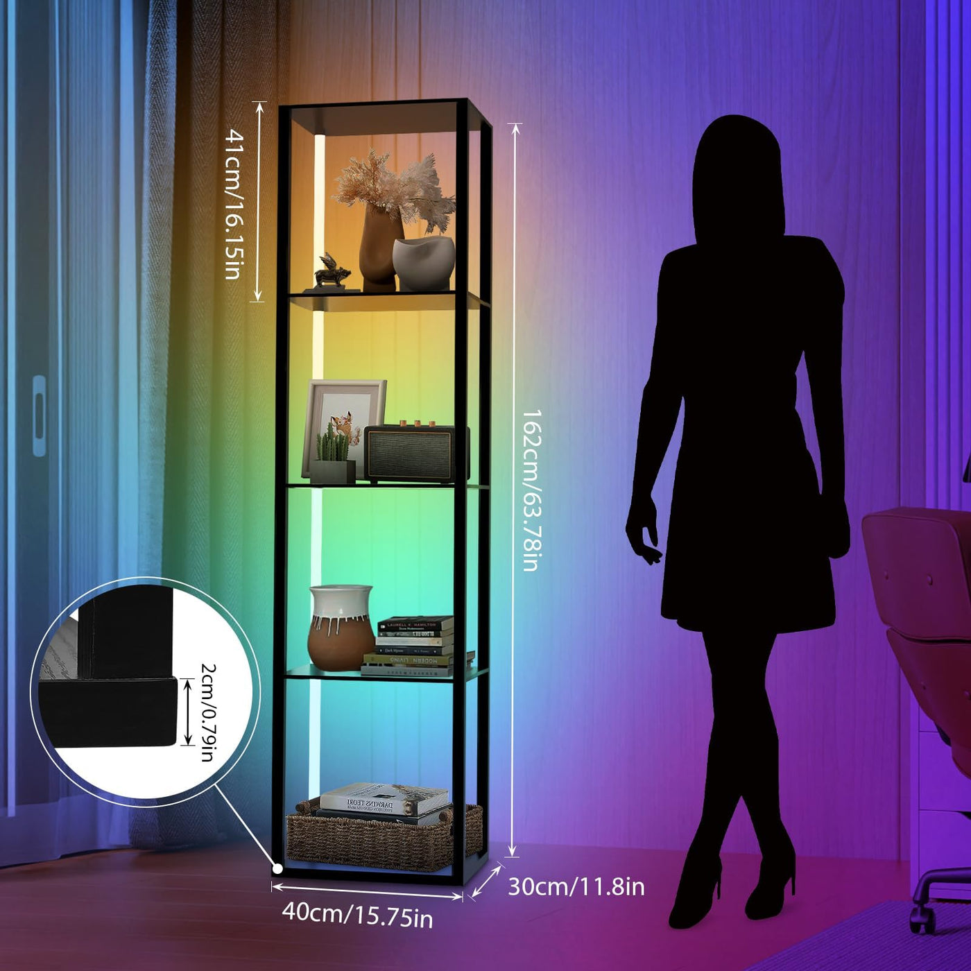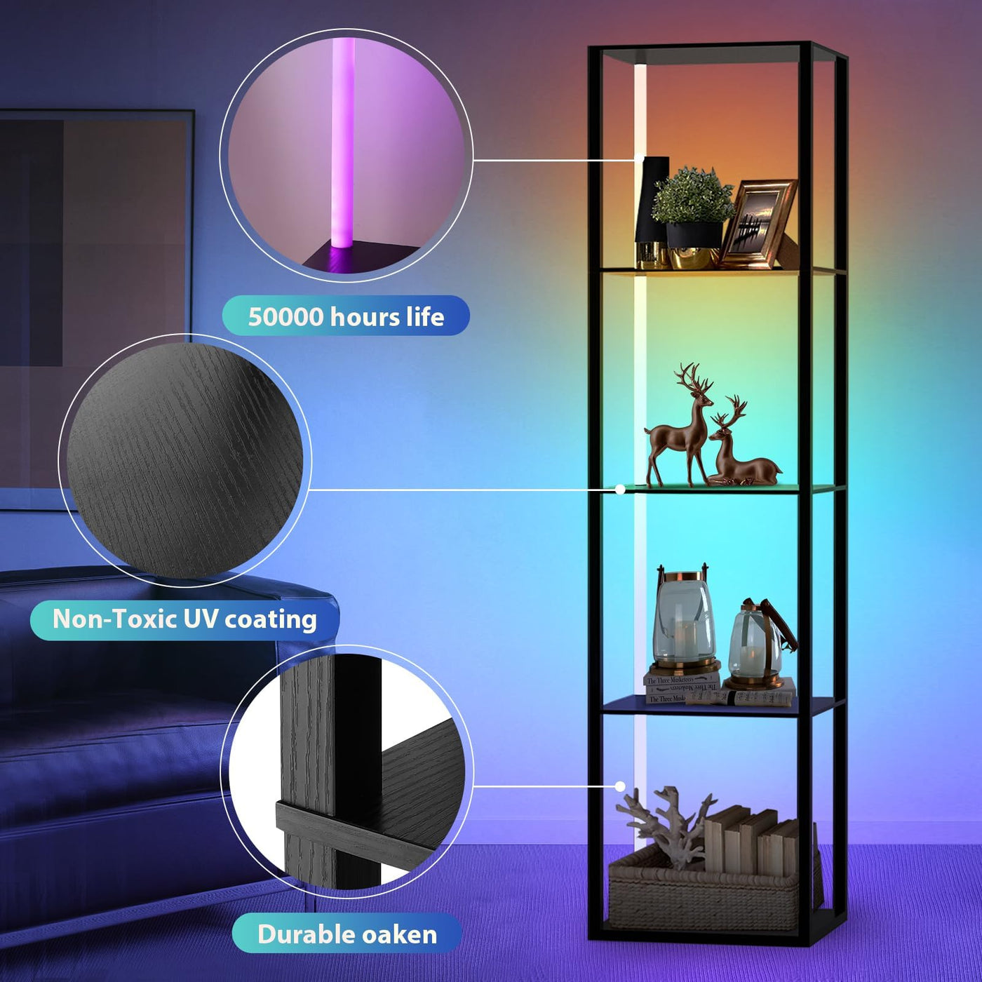 Caupel 5 Tiers Corner Shelf with LED Light, 63.78'' Tall Display Shelf for Collectibles, LED Corner Floor Lamp with APP and Remote Control for Living Room Bedroom Gamingroom Decor