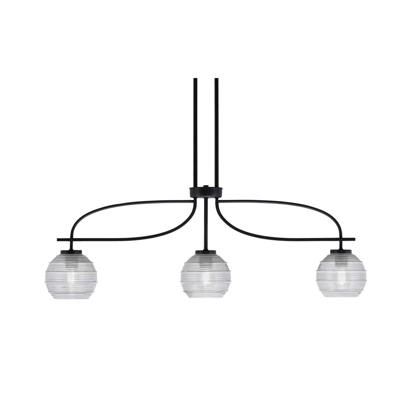 Cavella 3 Light Island Light Shown In Matte Black Finish With 6" Clear Ribbed Glass