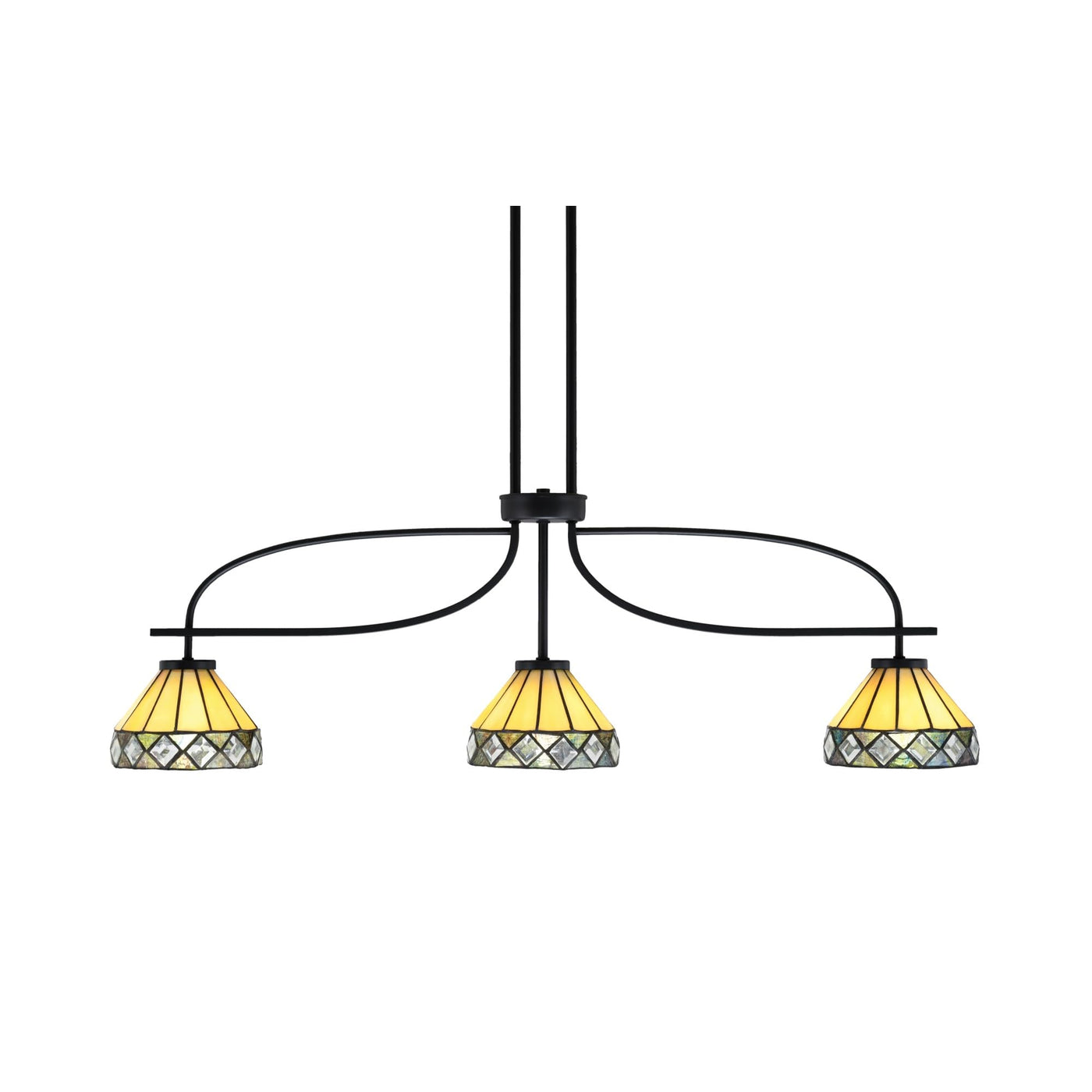 Cavella 3 Light Island Light Shown In Matte Black Finish With 7" Diamond Peak Art Glass