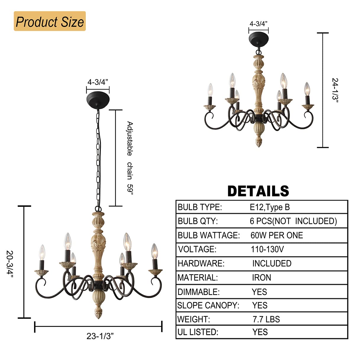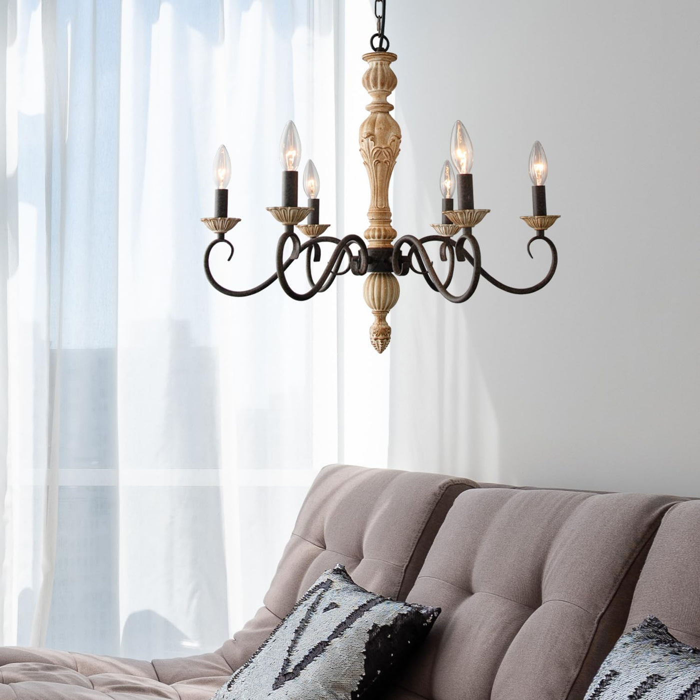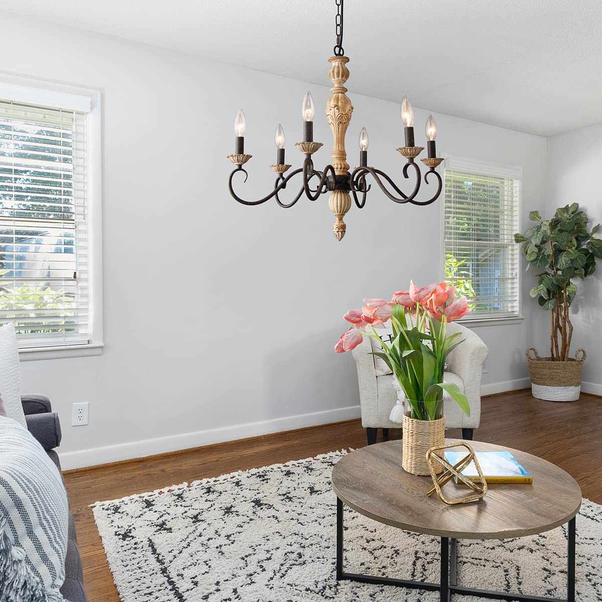 Cawabien French Country Chandelier-Farmhouse Chandeliers For Dining Room 6 Lights Fixture Rust Imitation Wood Finish For Living