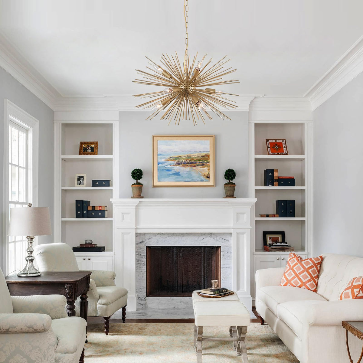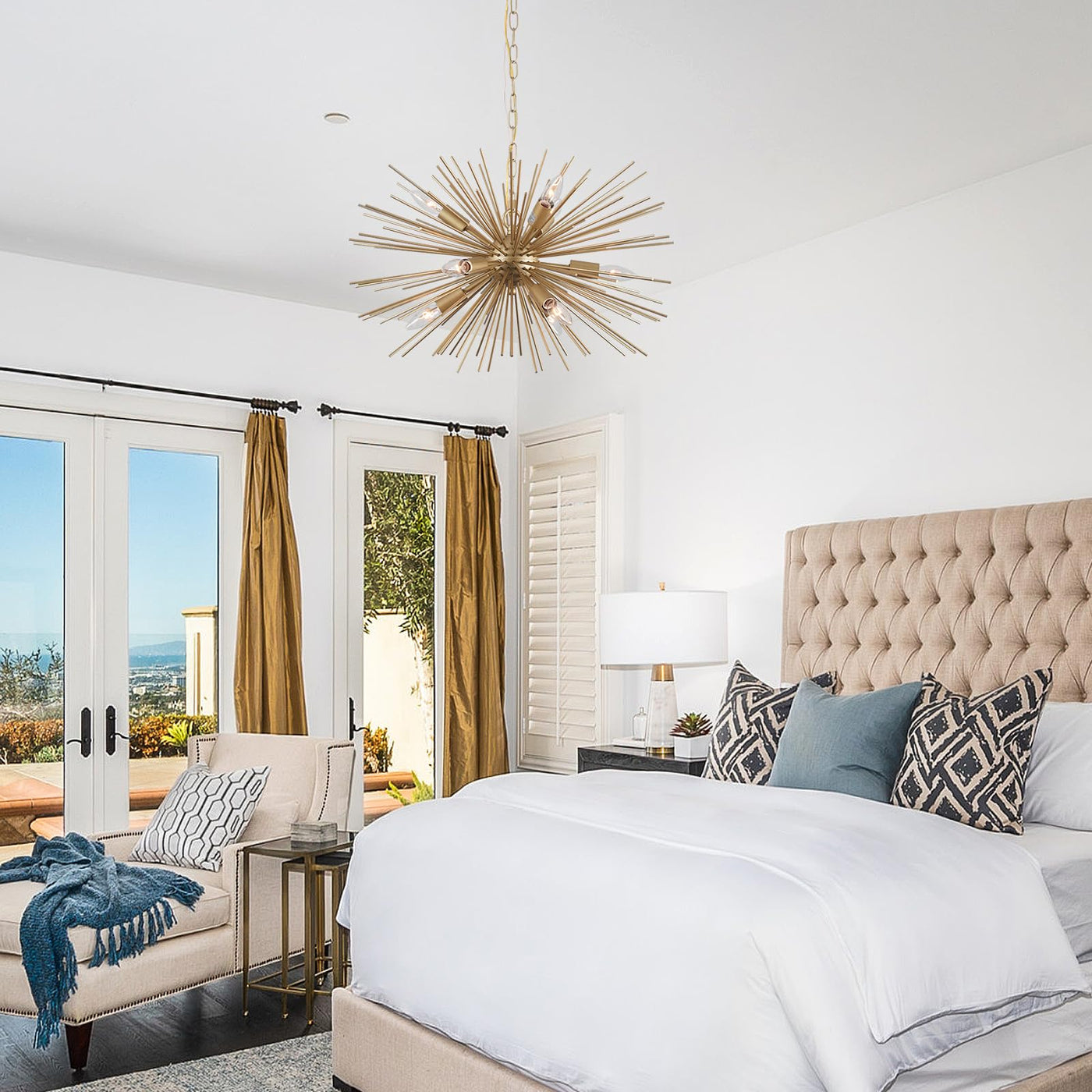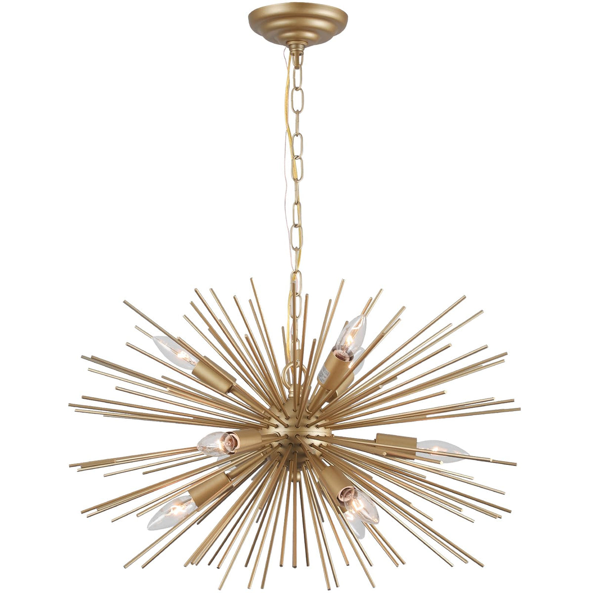 Make a bold statement in your space with this eye-catching sputnik chandelier that combines mid-century modern design with contemporary flair. This striking light fixture features multiple slender arms radiating from a central sphere in a dramatic starburst pattern, creating an artistic focal point that commands attention. The metallic gold finish adds warmth and sophistication while casting beautiful shadows and light patterns on your walls and ceiling. Perfect for dining rooms, entryways, or living spaces, this chandelier provides both ambient lighting and sculptural appeal. The adjustable arms allow you to customize the final look, whether you prefer a more condensed or expanded silhouette. When illuminated, it creates a stunning display that transforms any room into an elegant, modern sanctuary. Installation by a qualified electrician is recommended for optimal placement and safety.