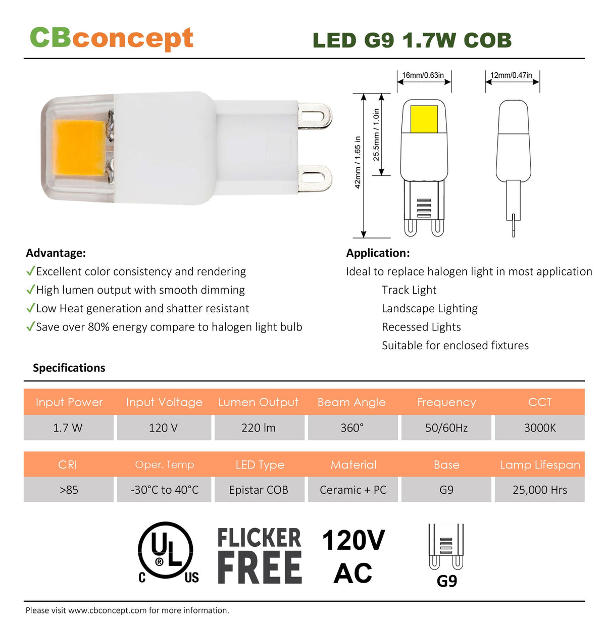 Q: How do I ensure the longevity of these halogen bulbs?A: To maximize the lifespan of the CBconcept G9 Halogen Light Bulb, avoid touching the glass with your bare hands, as oils from your skin can reduce the bulb's life. Ensure proper ventilation in fixtures to prevent overheating, and use them as recommended for the intended application.