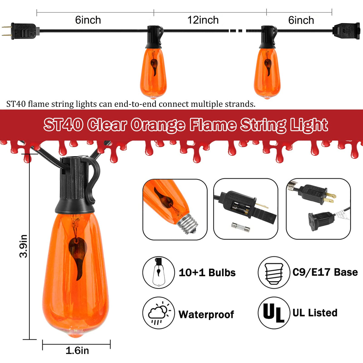 - **Spooky Flicker Flame Design**: Features 11 ST40 clear orange Edison bulbs that flicker like real flames, creating a horror-inspired atmosphere ideal for Halloween festivities.