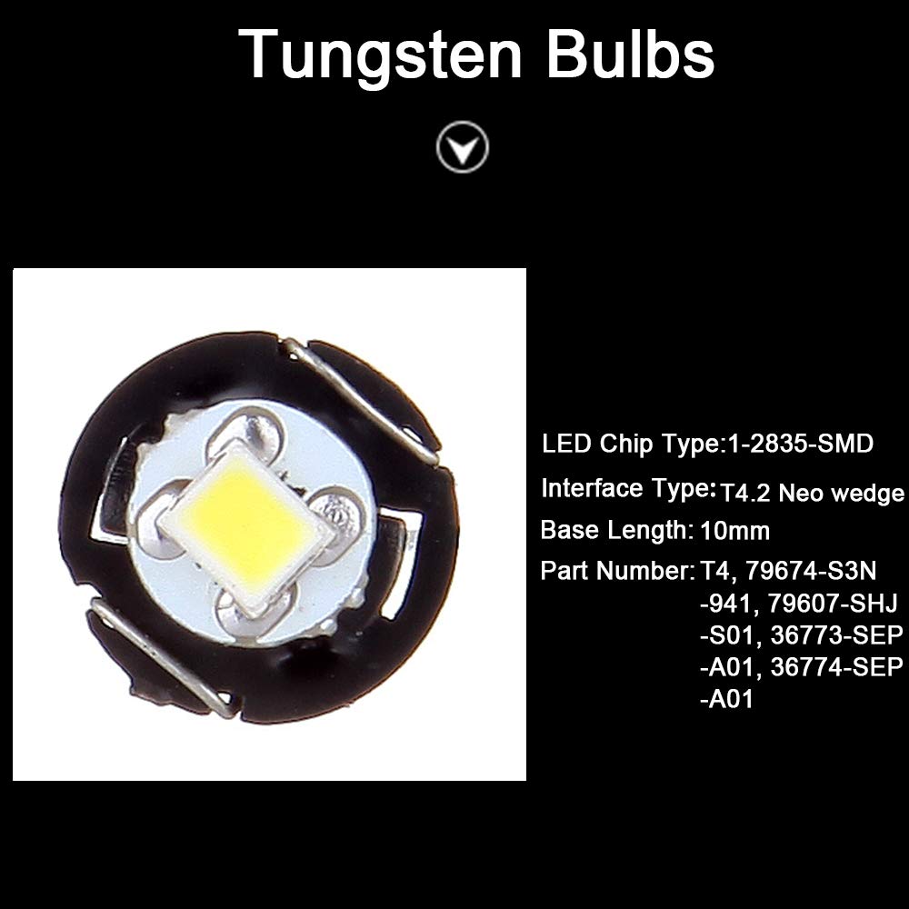 6 pieces White 2835-Chips LED bulbs, Neo Wedge Wide Angle bulbs provides wide angle beam and excellent wide spread of light.These units are excellent for replacing instrument cluster panel,dashboard gauge light bulbs.Much brighter than the stock OEM yellowish tungsten lamps.Tasted many times, it can be used in most cars. Feature: Color: White Led Type: T4.2 Neo Wedge 2835-SMD Light Bulbs Base Plate: 10mm Weight: 7.17g Voltage: 12V-14V Other Part Number: Bright:Pure White T4.2 Instrument Panel And Gauges Application: T4: 79674-S3N-941 79607-SHJ-S01 Application 2: T4: 36773-SEP-A01 36774-SEP-A01 Note: - Since the nature of the item being offered might fit a large variety of different vehicle and function. - Before you buy, Pls make sure T4/T4.2 Neo Wedge Socket first. - Latest European band cars may need to use built-in Canbus Led to avoid the error code. - If it doesn't light up, simply Rotating it 180 degrees (reverse the polarity) . - If you have any questions, please us for more details.