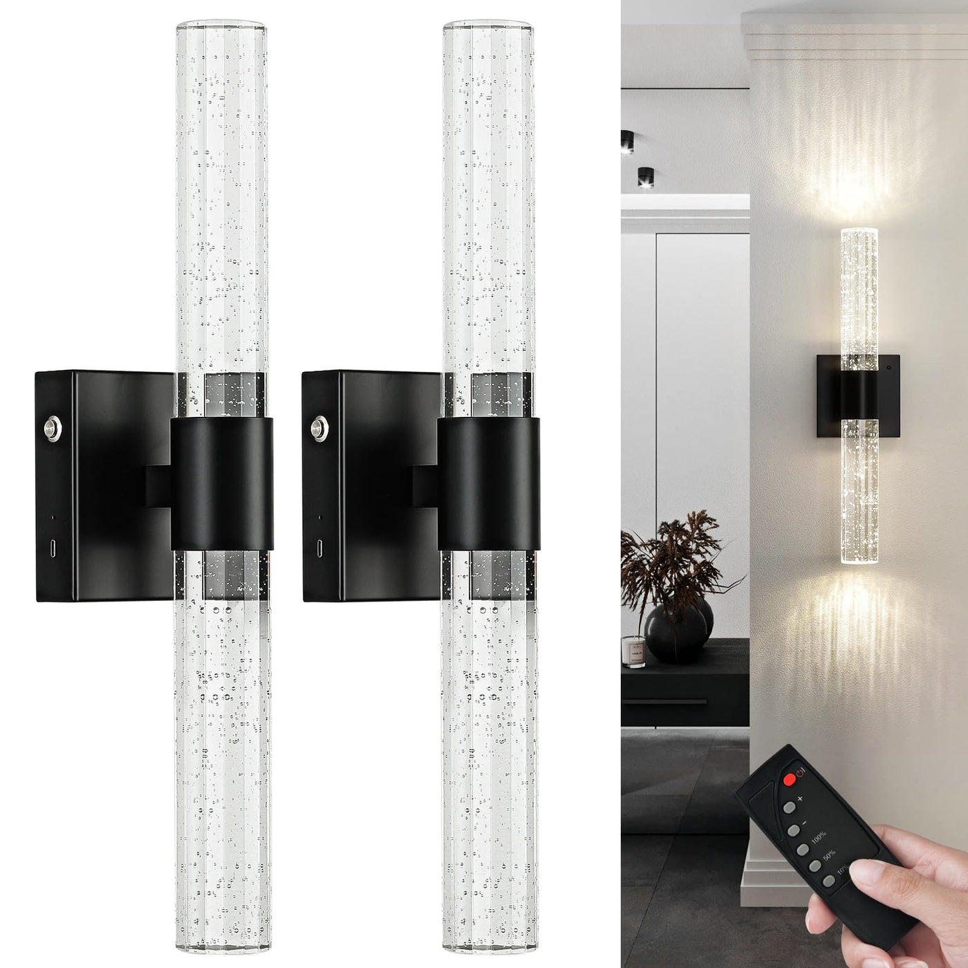 Ccycol Battery Operated Wireless Wall Sconces Set Of Two, Rechargeable Black Wall Sconce Set Of 2 With Remote Control, Modern Le