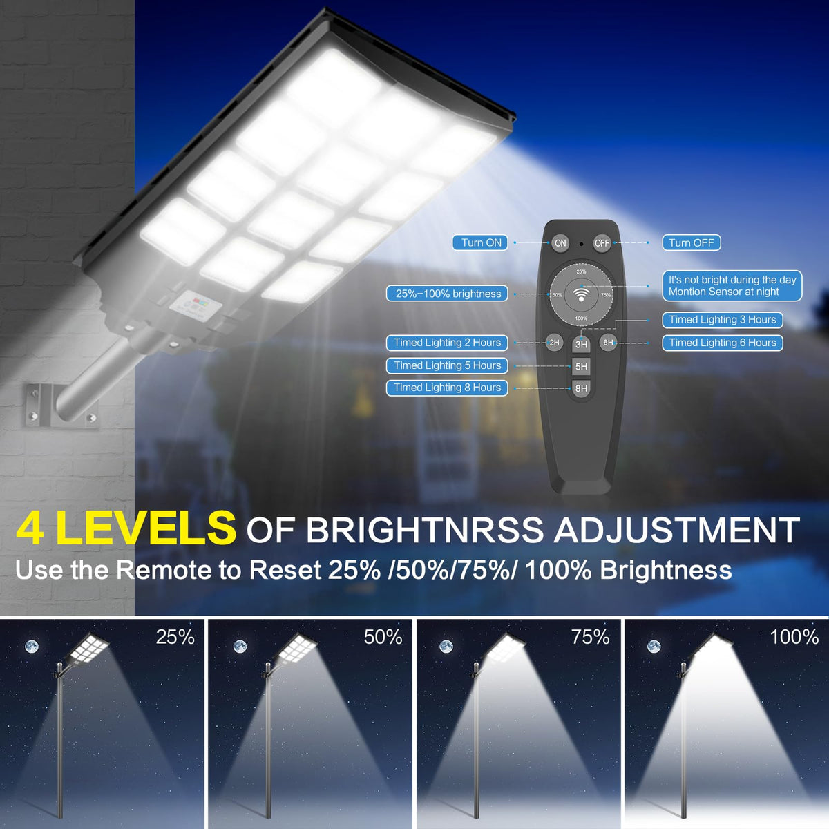 Q: Can the lighting modes be adjusted based on needs?A: Yes, the CEDIO Solar Street Lights come with a remote control that allows you to choose different lighting modes, including Motion Sensor mode, Timed Lighting mode, and Always Lighting mode, with adjustable brightness levels from 30% to 100%.