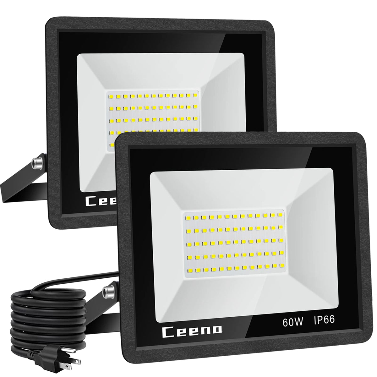 Ceena 2 Pack 60W Led Flood Light Outdoor,6000Lm Super Bright Work Lights With Plug And Switch,6000K Daylight White,Ip66 Waterproof Security Lights For Garage,Backyard,Patio,Playground