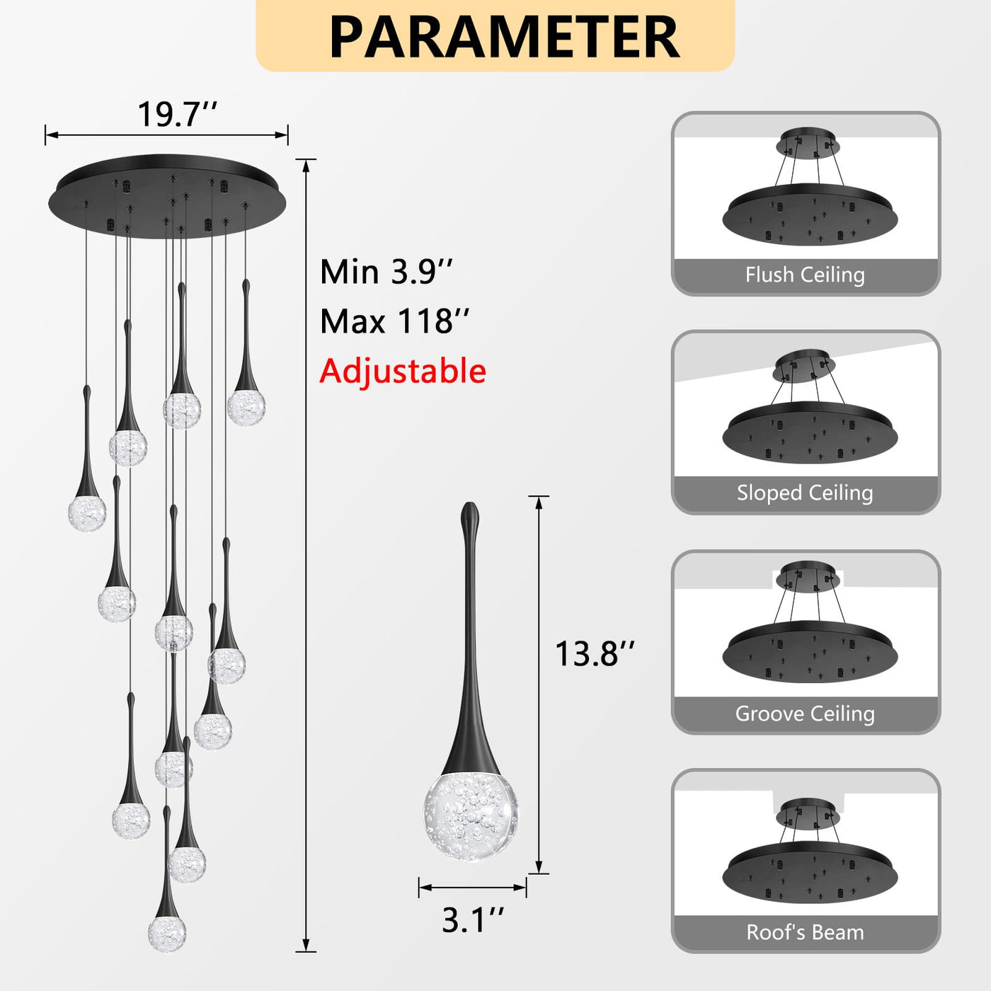 Illuminate your living space with a modern LED dimmable crystal chandelier that combines elegance and energy efficiency. This stunning lighting fixture features a sleek design with dazzling crystal accents that refract a captivating light. The LED bulbs not only provide bright, warm illumination but also offer exceptional energy savings compared to traditional incandescent bulbs. With its dimmable feature, you can easily adjust the light intensity to create the perfect ambiance for any occasion, whether it's a romantic dinner or a lively gathering. Elevate the aesthetic appeal of your room while enjoying the convenience and cost-effectiveness of LED technology. Measuring approximately, this chandelier is an idea l choice for adorning entryways, dining rooms, or living areas with a touch of contemporary sophistication.