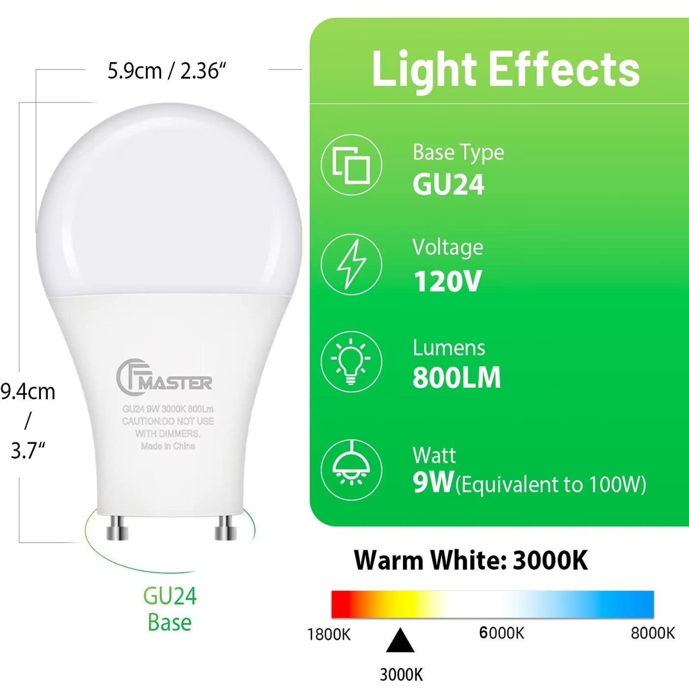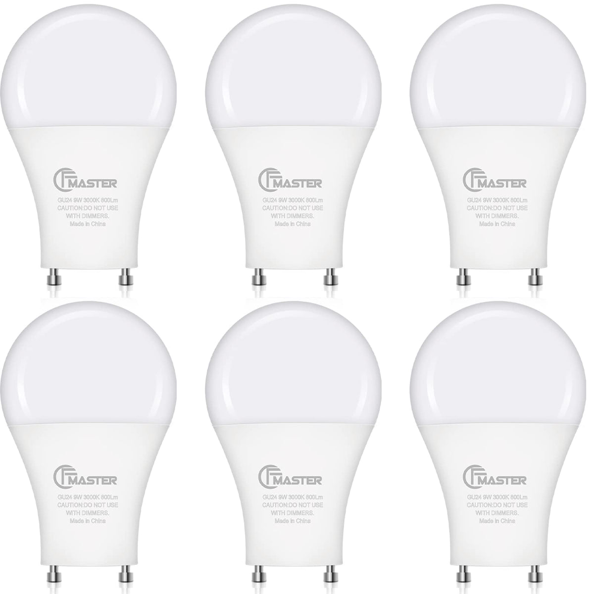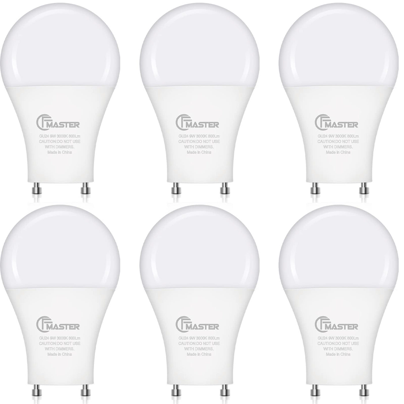 Cfmaster Gu24 Led Light Bulb, 3000K Warm White, 9W(100W Equivalent), 800 Lumens, A19 Shape Gu24 Led Bulbs, Twist And Lock Gu24 Pin Base With Two Prongs, Non-Dimmable, Ul Etl Certificated(6-Pack)