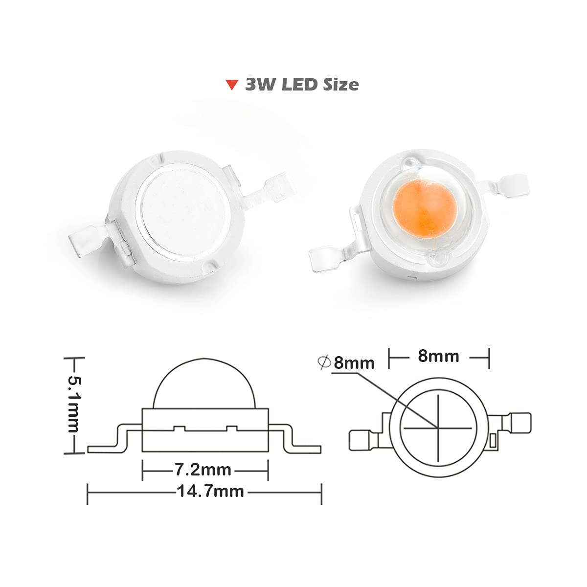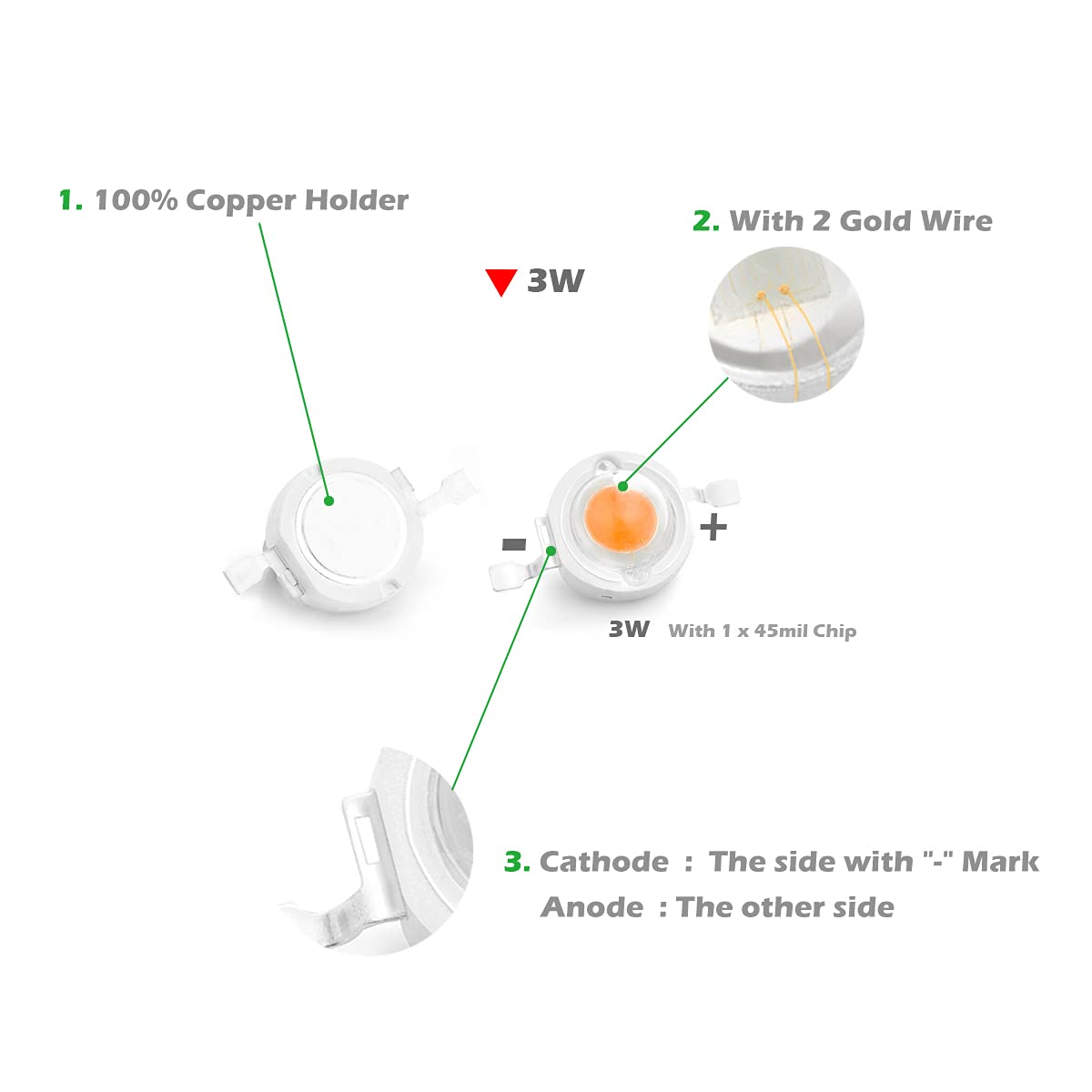 Specification:Quantity: 10 pieces / PackBrand: ChanzonPower: 3 Watt (Max)Emitting Color: Full Spectrum (380nm-840nm)Recommended Current: 450mAForward Voltage: 3.0-3.4VLuminous Flux: 90-100LMEmitting Angle: 120-140 degreeWith Double Golden Wire (99.99%) and Copper FrameKindly Reminder:Constant current LED drivers are recommended for high power COB LEDs.Working temperature should be less than 60 Degrees Celsius / (140 Fahrenheit) with a Heat Sink System.Please refer to the positive (anode +) and negative (cathode -) sign on Leds.Related Accessories:Constant current LED drivers (450mA Plastic Case): ? Search B01N25KD4X on AmazonConstant current LED drivers (450mA Aluminum Case Waterproof): ? Search B01MYBGU2X on AmazonConstant current LED drivers (450mA No Case only PCB Board): ? Search B01MSANI4E on AmazonLED Heat Sink Star Aluminum Base Plate: ? Search B06XKPNRWL on Amazon