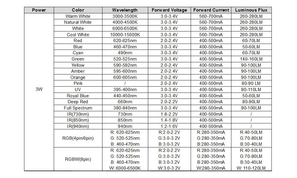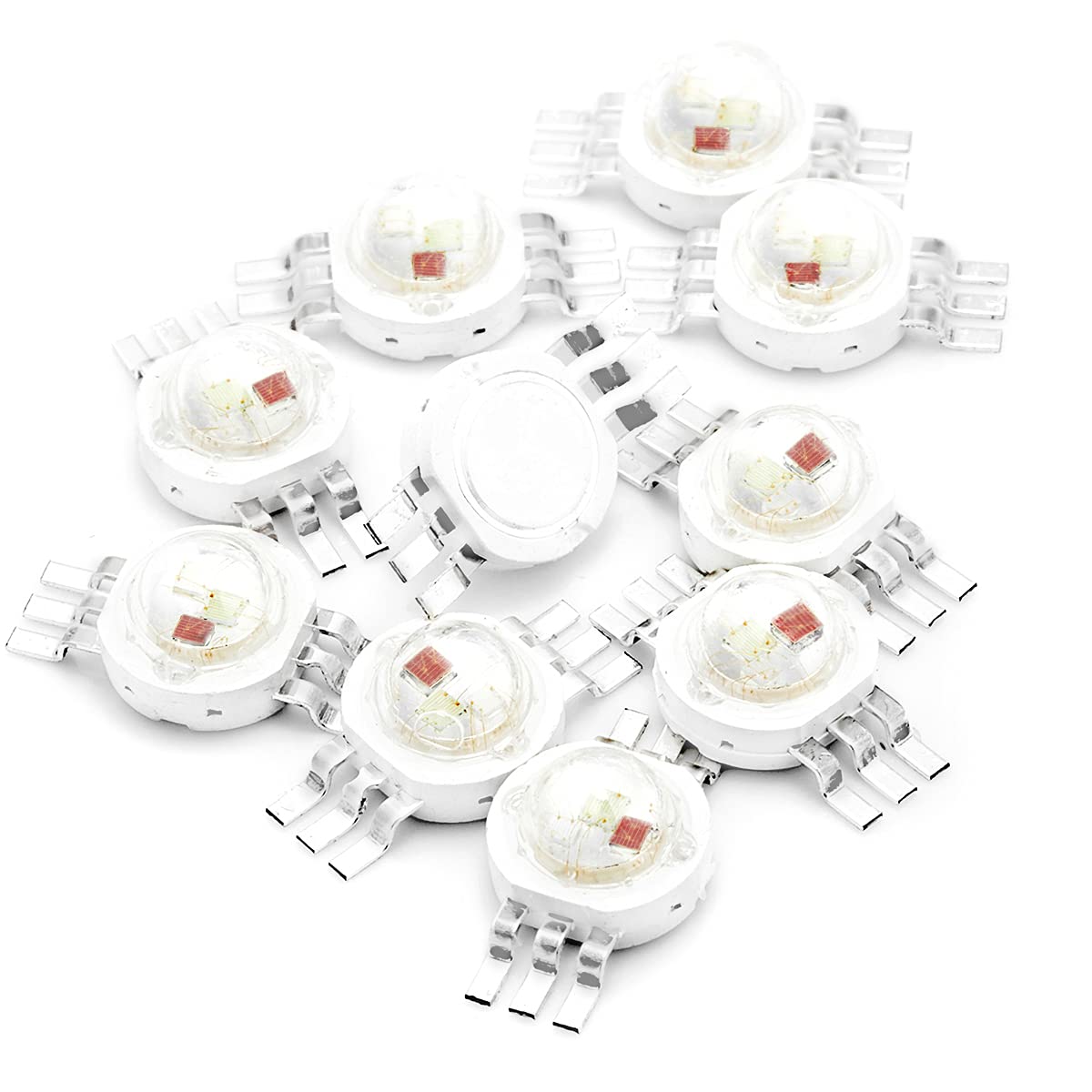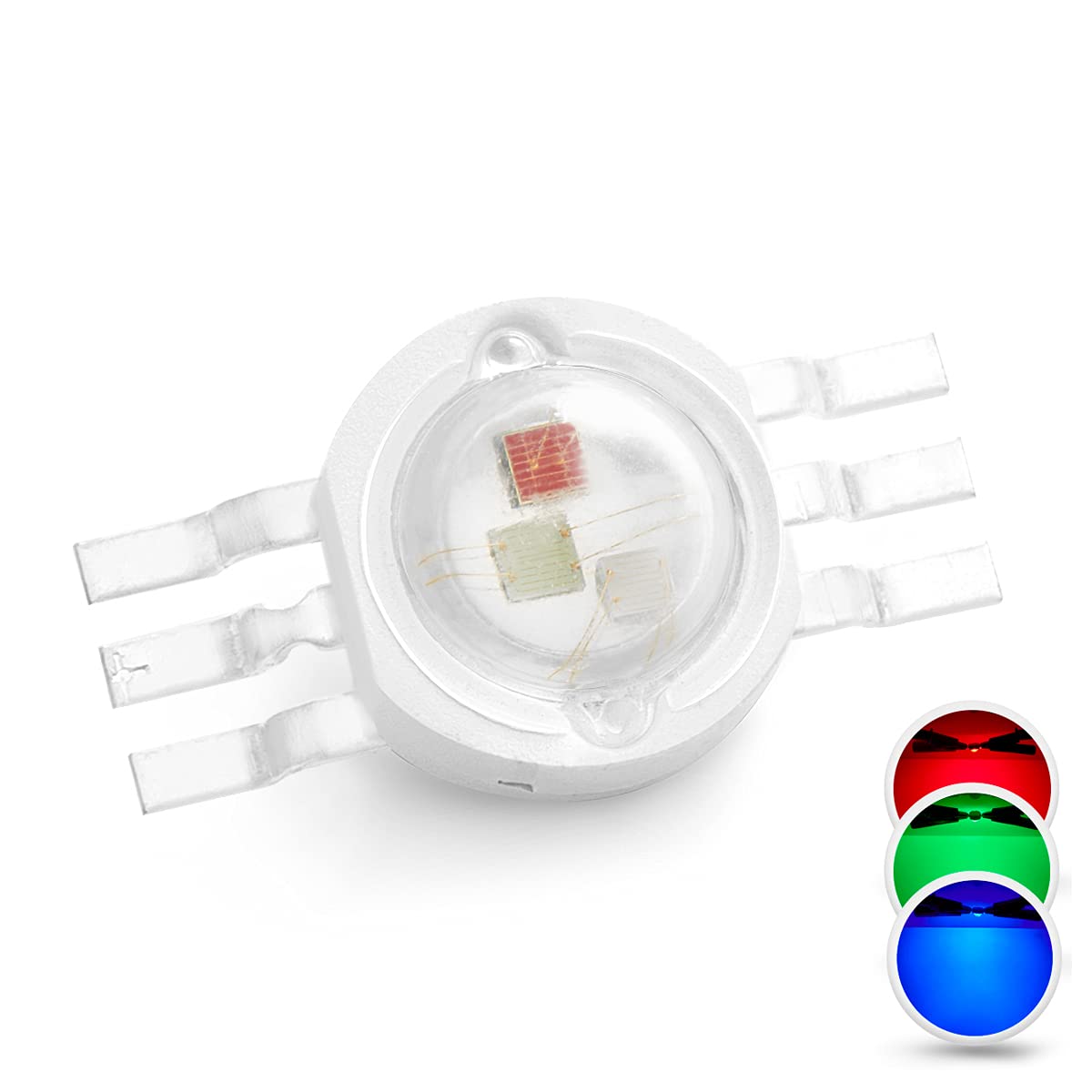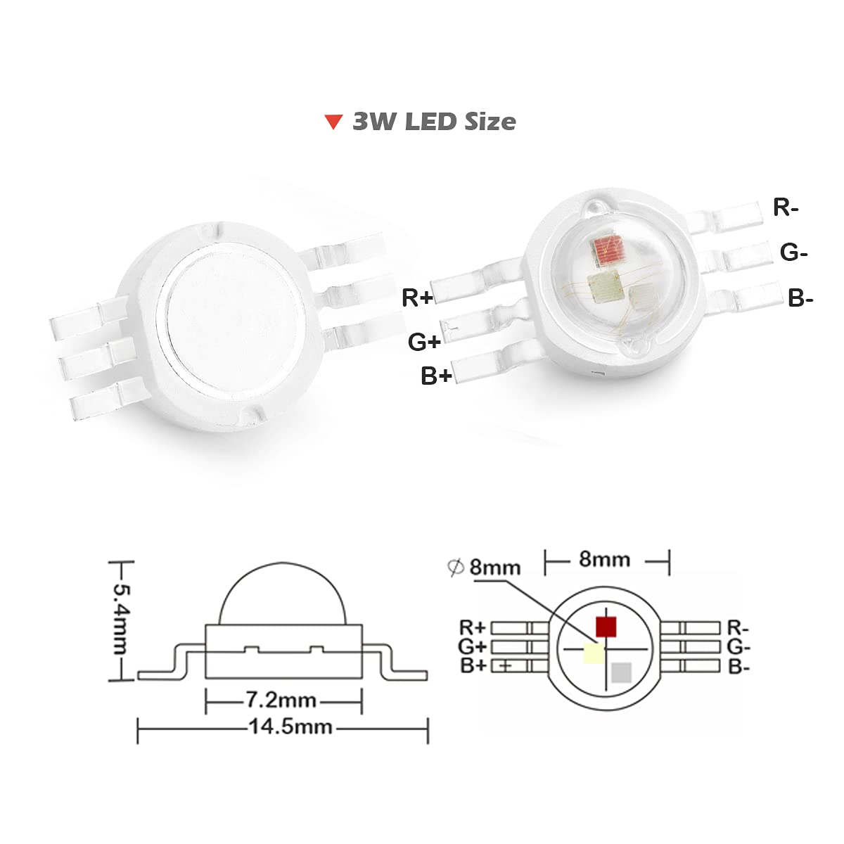 Specification:Quantity: 10 pieces / PackBrand: ChanzonPower: 3 Watt (Max)Emitting Color: RGB (Red Green Blue)Recommended Current: 300mA / ColorForward Voltage: R:2.0-2.4V G:3.0-3.4V B:3.0-3.4VLuminous Flux: R:50-60LM / G:80-90LM / B:40-50LMEmitting Angle: 120-140 degreeWith Double Golden Wire (99.99%) and Copper FrameKindly Reminder:Constant current LED drivers are recommended for high power COB LEDs.Working temperature should be less than 60 Degrees Celsius / (140 Fahrenheit) with a Heat Sink System.Please refer to the positive (anode +) and negative (cathode -) sign on Leds.Related Accessories:LED Heat Sink Star Aluminum Base Plate: ? Search B06XKW6CX2 on Amazon