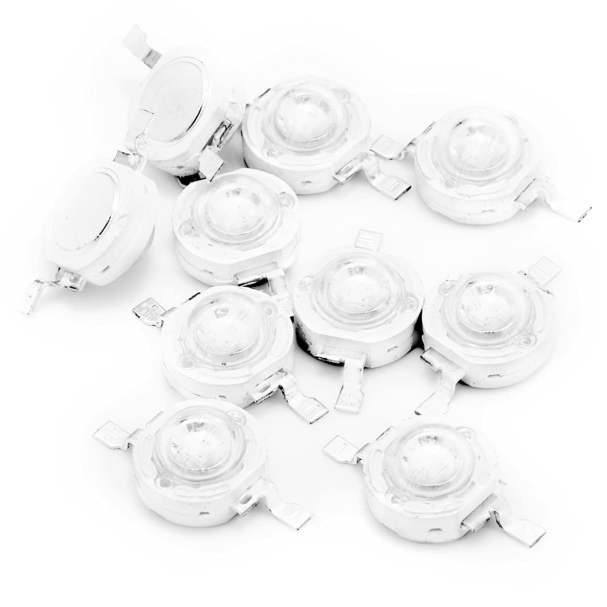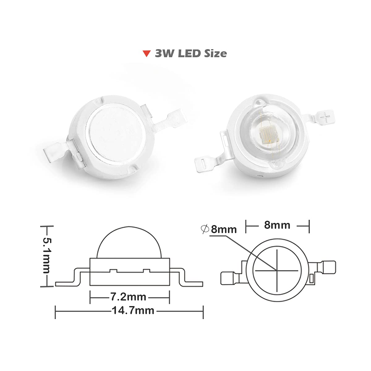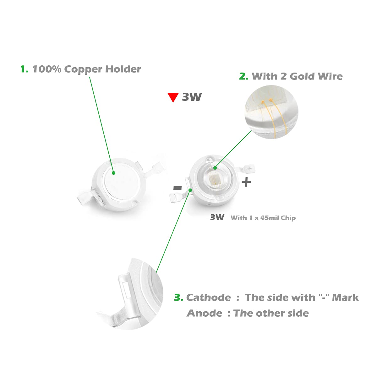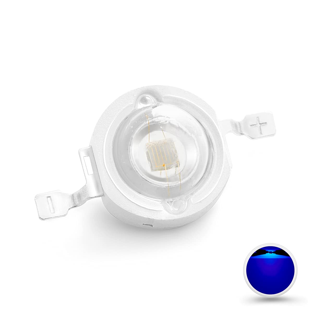 Specification:Quantity: 10 pieces / PackBrand: ChanzonPower: 3 Watt (Max)Emitting Color: Royal Blue (440nm-450nm)Recommended Current: 450mAForward Voltage: 3.0-3.4VLuminous Flux: 50-60LMEmitting Angle: 120-140 degreeWith Double Golden Wire (99.99%) and Copper FrameKindly Reminder:Constant current LED drivers are recommended for high power COB LEDs.Working temperature should be less than 60 Degrees Celsius / (140 Fahrenheit) with a Heat Sink System.Please refer to the positive (anode +) and negative (cathode -) sign on Leds.Related Accessories:Constant current LED drivers (450mA Plastic Case): ? Search B01N25KD4X on AmazonConstant current LED drivers (450mA Aluminum Case Waterproof): ? Search B01MYBGU2X on AmazonConstant current LED drivers (450mA No Case only PCB Board): ? Search B01MSANI4E on AmazonLED Heat Sink Star Aluminum Base Plate: ? Search B06XKPNRWL on Amazon