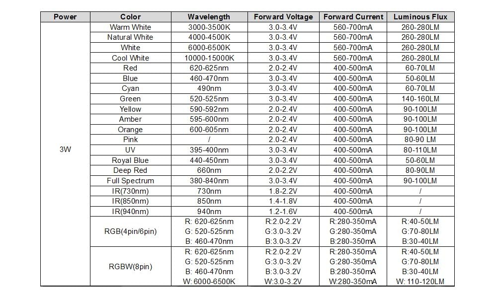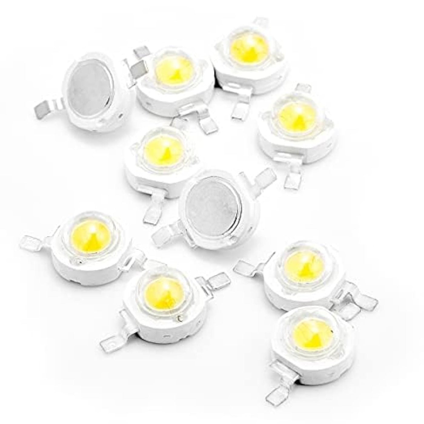 Specification:Quantity: 10 pieces / PackBrand: ChanzonPower: 3 Watt (Max)Emitting Color: Warm White (3000-3500K)Recommended Current: 600mAForward Voltage: 3.0-3.4VLuminous Flux: 260-280LMEmitting Angle: 120-140 degreeWith Double Golden Wire (99.99%) and Copper FrameKindly Reminder:Constant current LED drivers are recommended for high power COB LEDs.Working temperature should be less than 60 Degrees Celsius / (140 Fahrenheit) with a Heat Sink System.Please refer to the positive (anode +) and negative (cathode -) sign on Leds.Related Accessories:Constant current LED drivers (600mA Plastic Case): ? Search B01N374QMQ on AmazonConstant current LED drivers (600mA Aluminum Case Waterproof): ? Search B01N25KB6C on AmazonConstant current LED drivers (600mA No Case only PCB Board): ? Search B01MR98MEX on AmazonLED Heat Sink Star Aluminum Base Plate: ? Search B06XKTRSP7 on Amazon