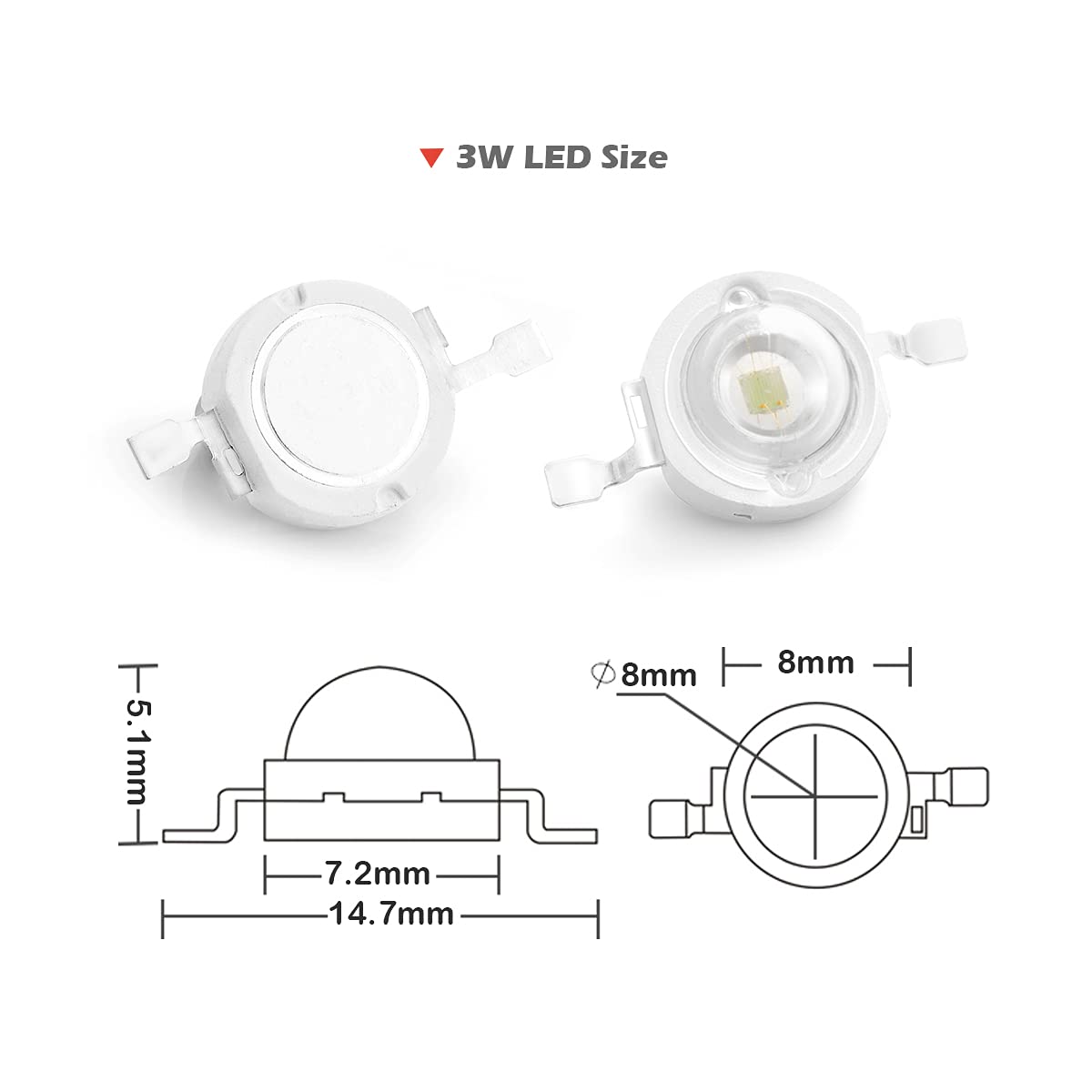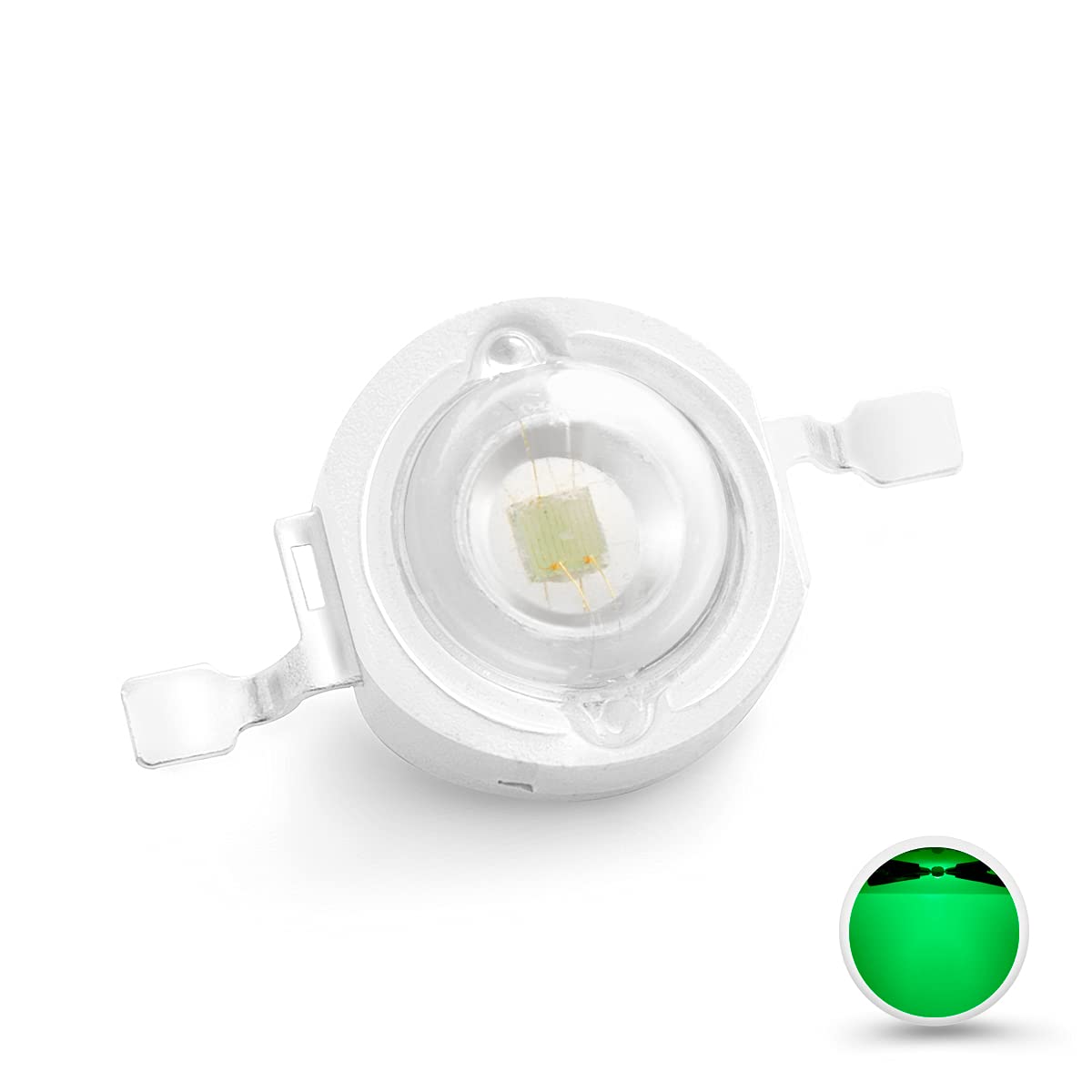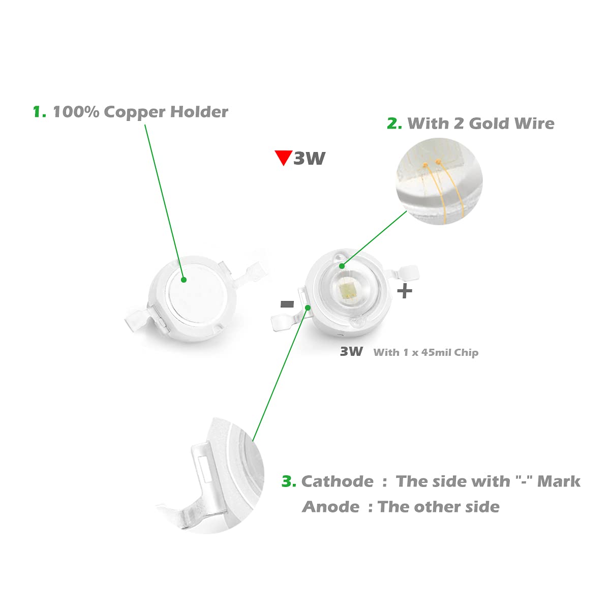 Specification:Quantity: 10 pieces / PackBrand: ChanzonPower: 3 Watt (Max)Emitting Color: GreenRecommended Current: 450mAForward Voltage: 3.0-3.4VLuminous Flux: 140-160LMEmitting Angle: 120-140 degreeWith Double Golden Wire (99.99%) and Copper FrameKindly Reminder:Constant current LED drivers are recommended for high power COB LEDs.Working temperature should be less than 60 Degrees Celsius / (140 Fahrenheit) with a Heat Sink System.Please refer to the positive (anode +) and negative (cathode -) sign on Leds.Related Accessories:Constant current LED drivers (450mA Plastic Case): ? Search B01N25KD4X on AmazonConstant current LED drivers (450mA Aluminum Case Waterproof): ? Search B01MYBGU2X on AmazonConstant current LED drivers (450mA No Case only PCB Board): ? Search B01MSANI4E on AmazonLED Heat Sink Star Aluminum Base Plate: ? Search B06XKPNRWL on Amazon